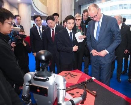 2月26日,德國總理默茨在杭州宇樹科技觀看機(jī)器人寫“?!弊?。新華社記者 翁忻旸 攝