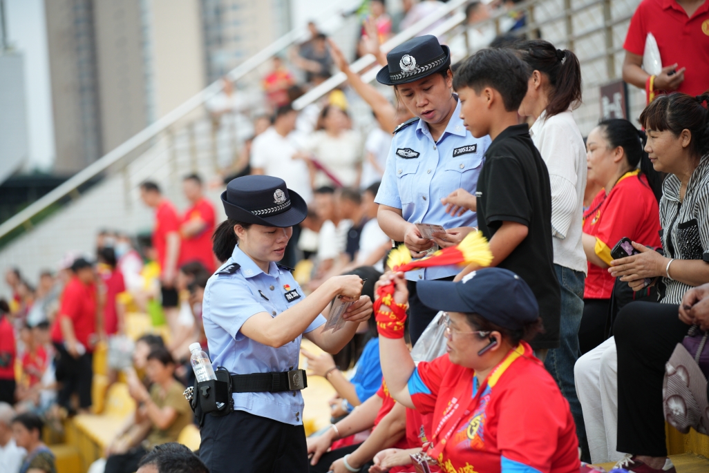 每逢平果市主場比賽日,各地球迷都會早早來到體育場外為球隊吶喊助威。而比球迷更早到達(dá)的,是平果市公安局的民輔警和安保人員。“每場比賽前,民警會提前4個小時到達(dá)現(xiàn)場開展安全排爆工作。場內(nèi)近3萬個座位、每一條過道、每一個看臺,以及場外的每一個重點區(qū)域,我們都要認(rèn)真排查?!逼焦泄簿指本珠L黃漢杰說。