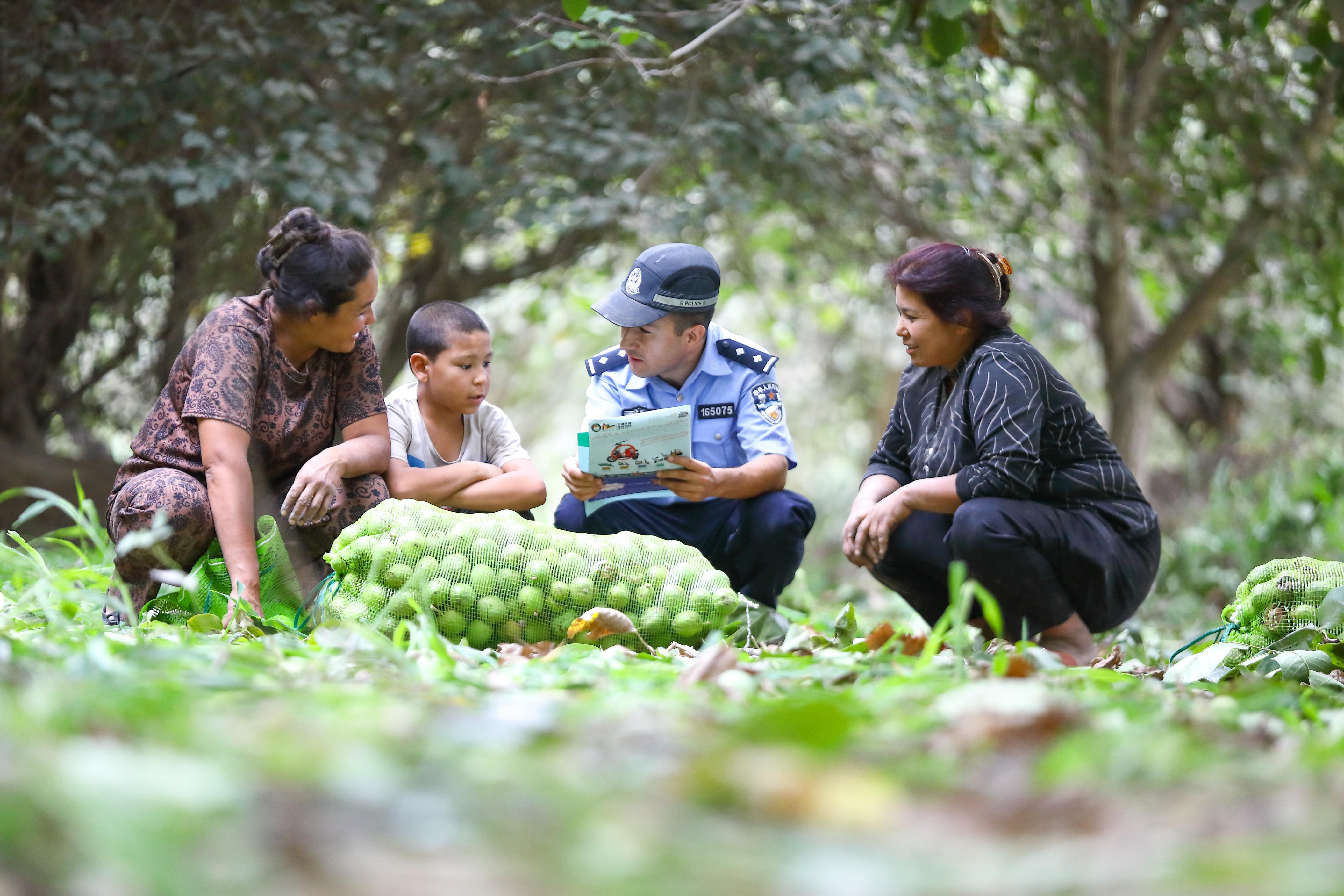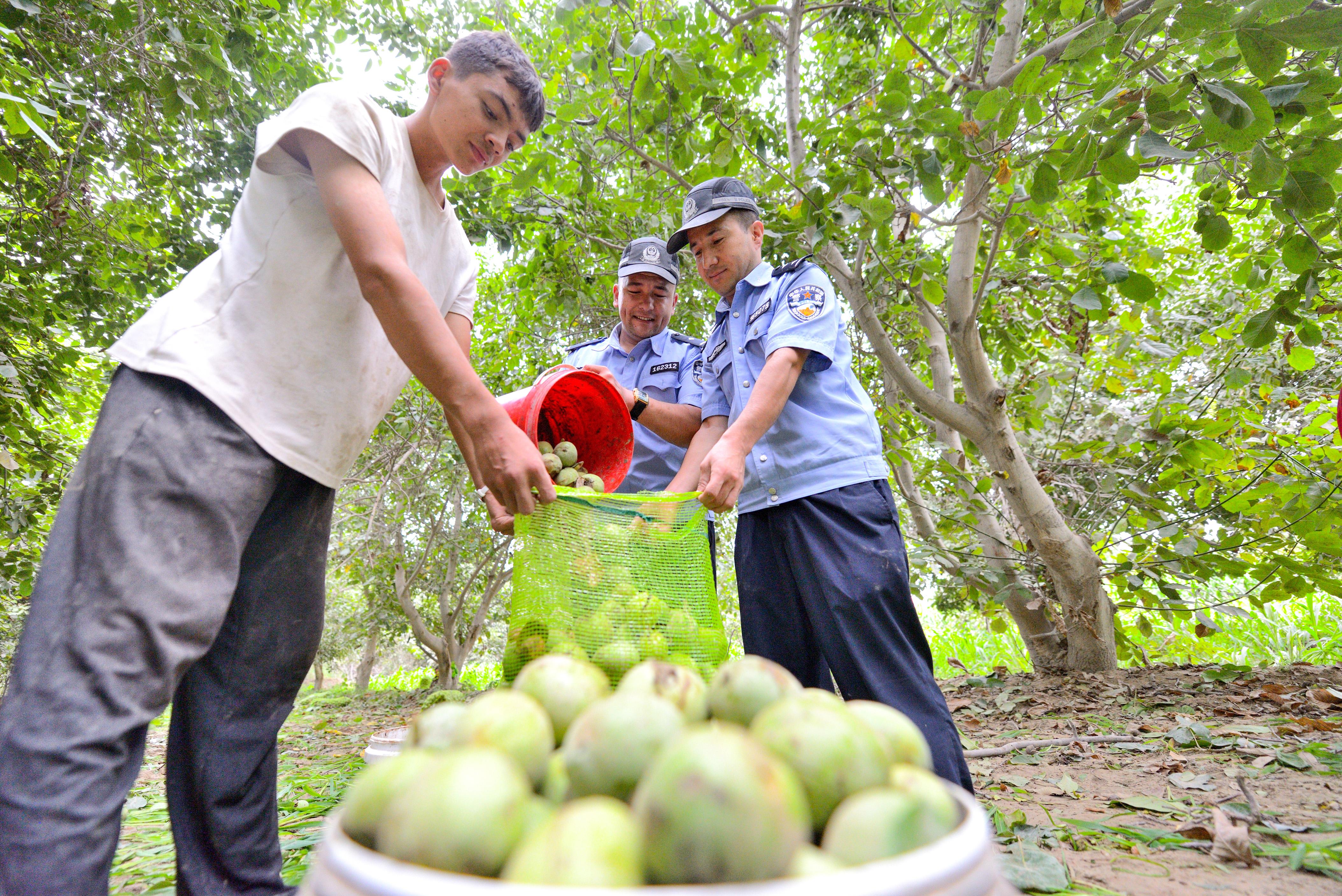 8月18日,在新疆葉城縣依力克其鄉(xiāng)的核桃園里,陣陣爽朗的招呼聲打破了田間的寧靜。葉城縣公安局依力克其鄉(xiāng)派出所組建的助農(nóng)小分隊深入轄區(qū)核桃園,一邊幫群眾采收核桃,一邊開展普法宣傳活動,用貼心服務(wù)獲得群眾的紛紛點贊,成為秋日里一道溫暖的風(fēng)景線。