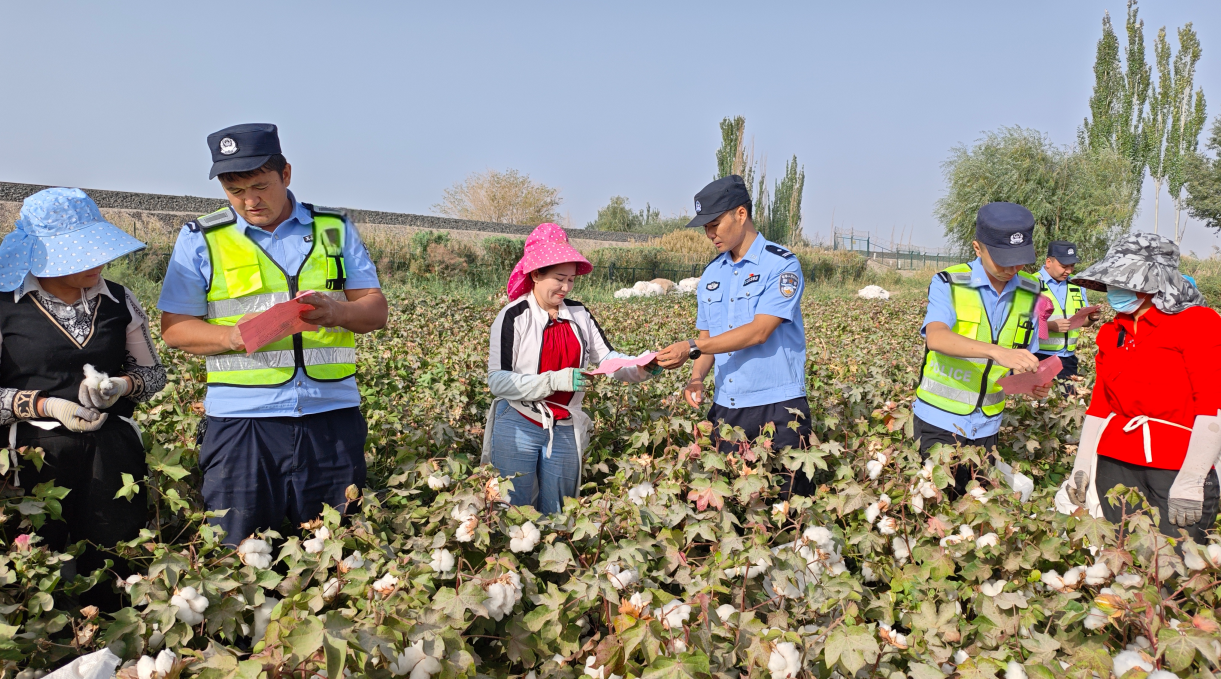 圖為9月22日,巴楚站派出所民警向轄區(qū)鐵路周邊棉田的棉農(nóng)開展普法宣傳。