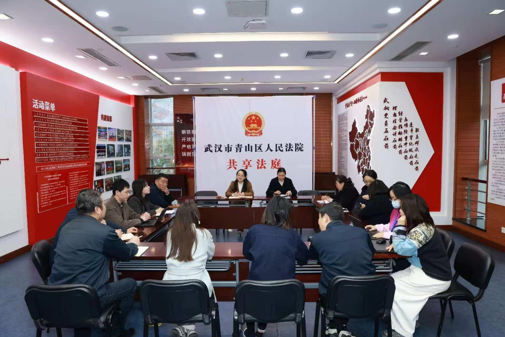 圖為青山區(qū)法院民二庭在武鋼共享法庭開庭?!?/span>