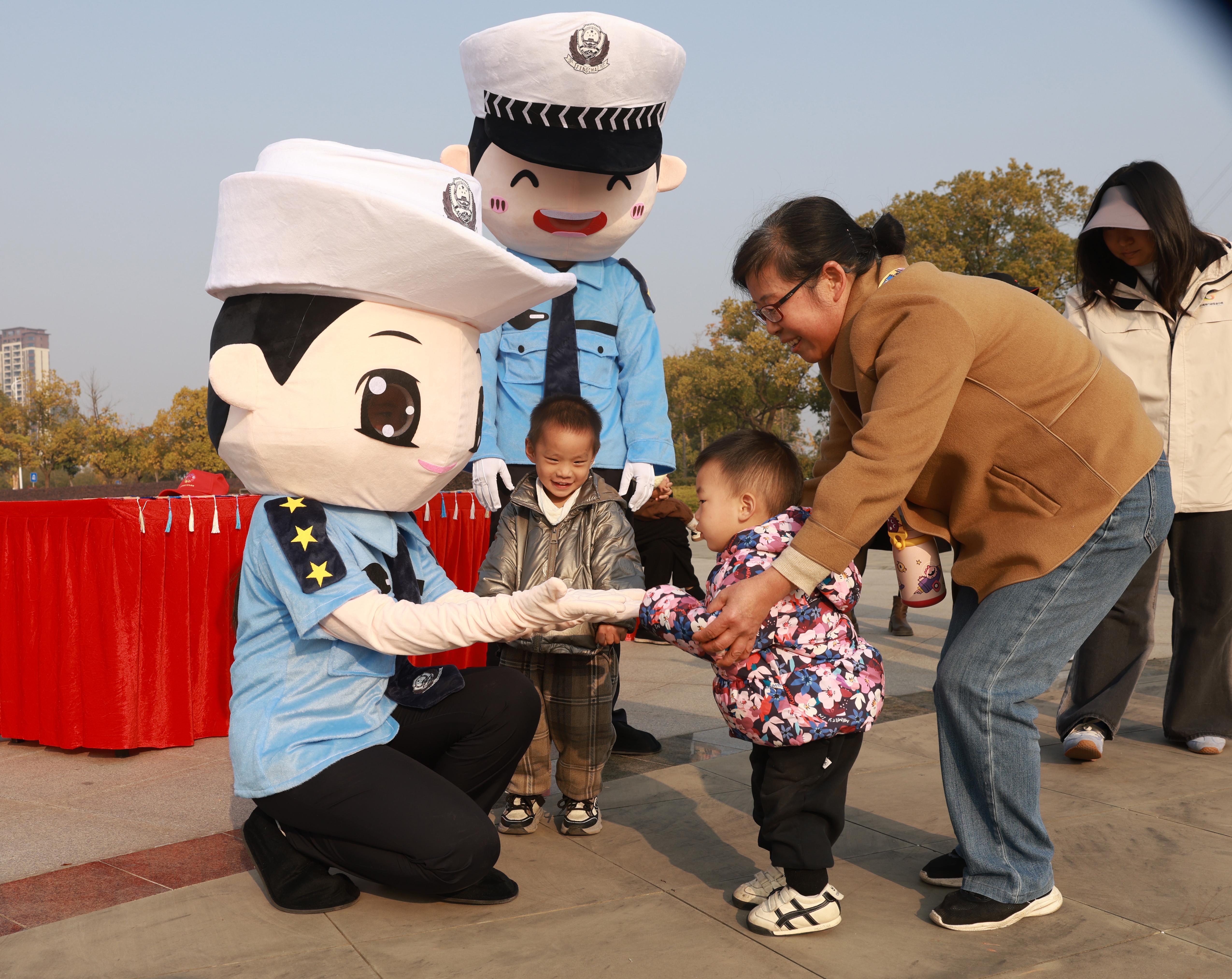 圖為交警玩偶“平平”“安安”與小朋友現(xiàn)場(chǎng)互動(dòng)。
