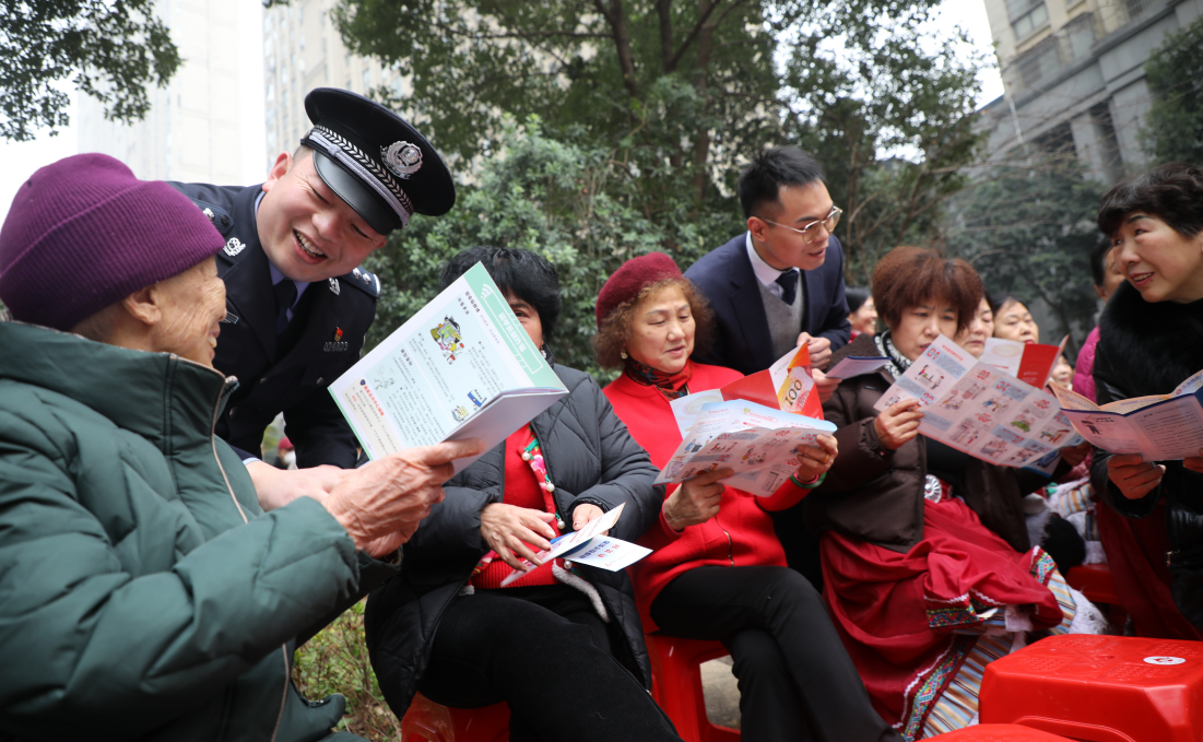 圖為1月17日,民警向社區(qū)居民宣傳反詐知識。