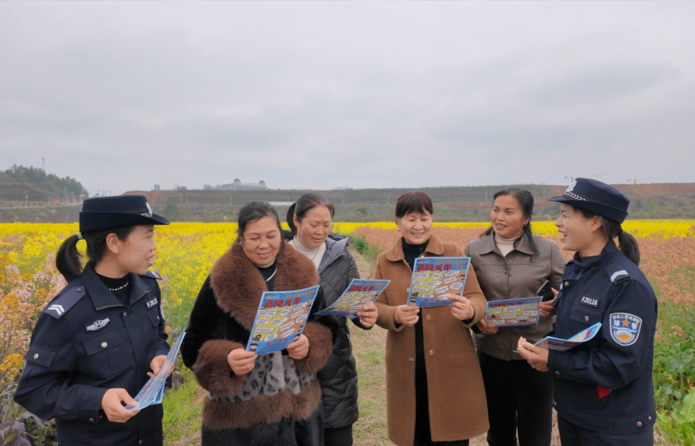 近日,江西省遂川縣萬畝油菜花進入盛花期,吸引不少游客前來踏青賞花。遂川縣公安局“遂心”女警宣傳隊走進賞花現(xiàn)場,通過以案說法、交流互動等方式,向游客宣傳反詐、禁毒、交通安全等知識,筑牢基層安全防線。