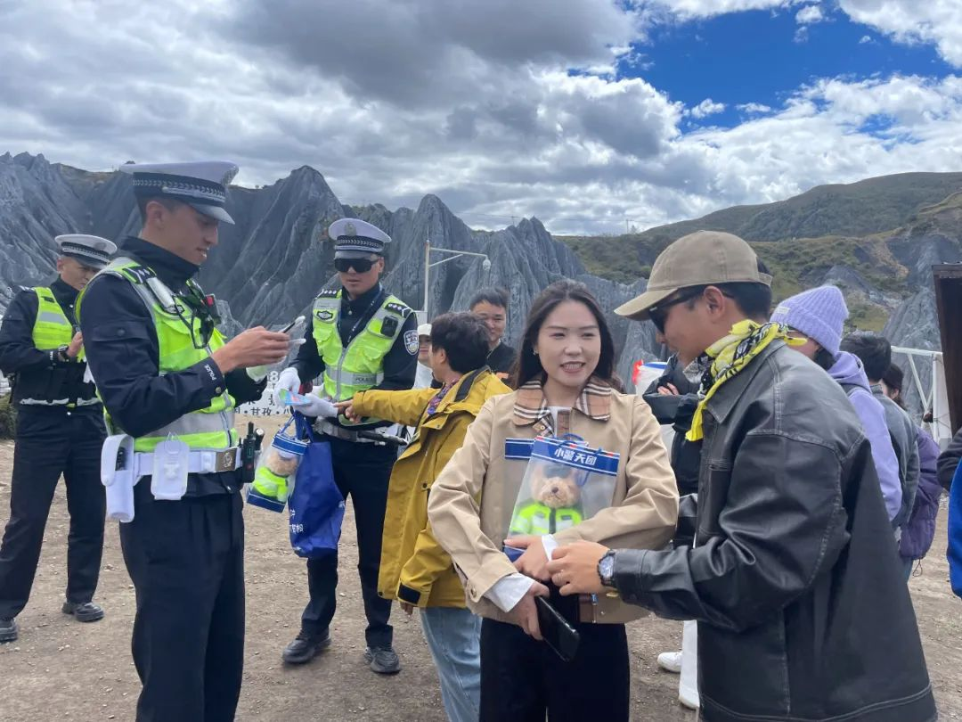 10月1日,在國慶“黃金周”首日,道孚縣八美鎮(zhèn)墨石公園景區(qū)迎來了第一批打卡的游客。道孚縣公安局交警大隊(duì)也為遠(yuǎn)道而來的客人們,準(zhǔn)備了一份精美的小禮品,包含“交警小熊”“水杯”“雨傘”等,游客們只需要回答交警現(xiàn)場開展的“假期平安行·交通安全知識競賽”,答對題目就能帶著禮品繼續(xù)環(huán)游甘孜。