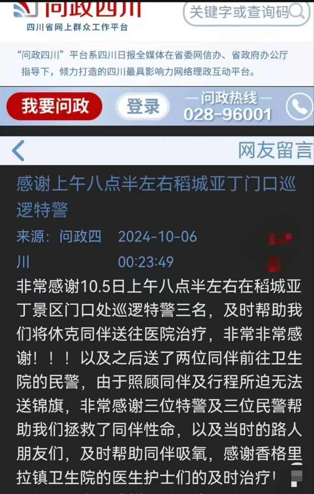 “非常感謝10月5日上午8點(diǎn)半,在亞丁景區(qū)門口的三位特巡警,將我們休克的同伴及時(shí)送往醫(yī)院治療。由于照顧同伴及行程所迫無法送錦旗,但這份恩情我們永遠(yuǎn)銘記在心!”10月6日,一封來自游客的感謝信投遞在“問政四川”平臺上,信中充滿了他對眾多好心人的感激之情。據(jù)稻城縣公安局特巡警大隊(duì)副大隊(duì)長四郎澤仁介紹,10月5日,亞丁景區(qū)迎來眾多游客。我和隊(duì)員們正在景區(qū)門口的執(zhí)勤點(diǎn)位上執(zhí)勤,確保游客的安全和秩序。突然,聽到一陣急促的呼救聲,我們立刻循聲跑去,只見一名女游客倒在地上,身體不停地發(fā)抖,已經(jīng)陷入休克狀態(tài)。“面對這突如其來的緊急情況,我們按照日常養(yǎng)成的急救常識,立即對游客進(jìn)行了初步判斷,根據(jù)其癥狀和表現(xiàn),我們判斷是由于缺氧所導(dǎo)致的,并立即對她進(jìn)行了初步的搶救。”在初步搶救后,該游客的情況雖有所緩解。于是,我和我的戰(zhàn)友們立即開辟起一條“綠色通道”,用警車將患者轉(zhuǎn)送至鎮(zhèn)衛(wèi)生院。為了不浪費(fèi)任何一分鐘的治療時(shí)間,到達(dá)衛(wèi)生院后特巡警隊(duì)員將患者背上,送入診療室。當(dāng)看到游客在醫(yī)生的救治下逐漸恢復(fù)意識,我們懸著的心也終于放了下來。那一刻,我們深深地感受到了作為一名警察的責(zé)任和使命。
