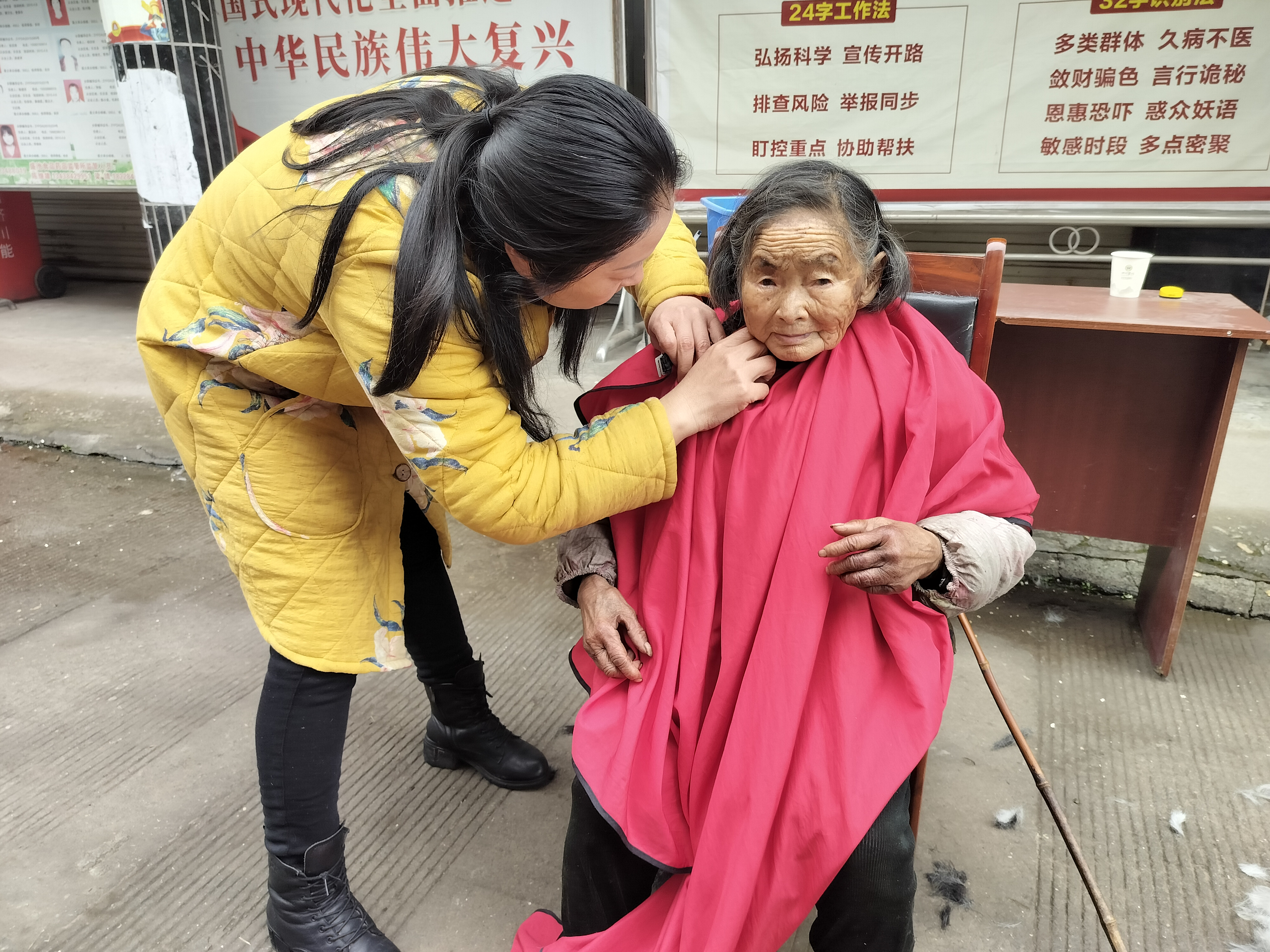 45歲的陳友華帶著全套理發(fā)工具,在鎮(zhèn)政府門前開設(shè)“流動理發(fā)店”。自2019年起,她長期利用閑暇時光扎根社區(qū),專為60歲以上的孤寡老人免費理發(fā)。她手法嫻熟,理發(fā)手藝好,得到了當?shù)厝罕姷恼J可和點贊。