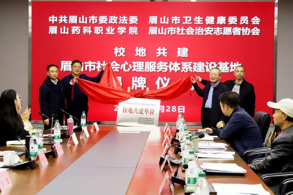 簽約儀式上,眉山藥科職業(yè)學(xué)院心理健康教育咨詢中心的工作人員首先介紹了基地共建的背景、目的與意義。隨后,中共眉山市委政法委、眉山市衛(wèi)生健康委員會、眉山藥科職業(yè)學(xué)院、眉山市社會治安志愿者協(xié)會共同簽訂四方共建協(xié)議,并為基地揭牌,同時為心理健康知識宣傳志愿服務(wù)隊授牌授旗。