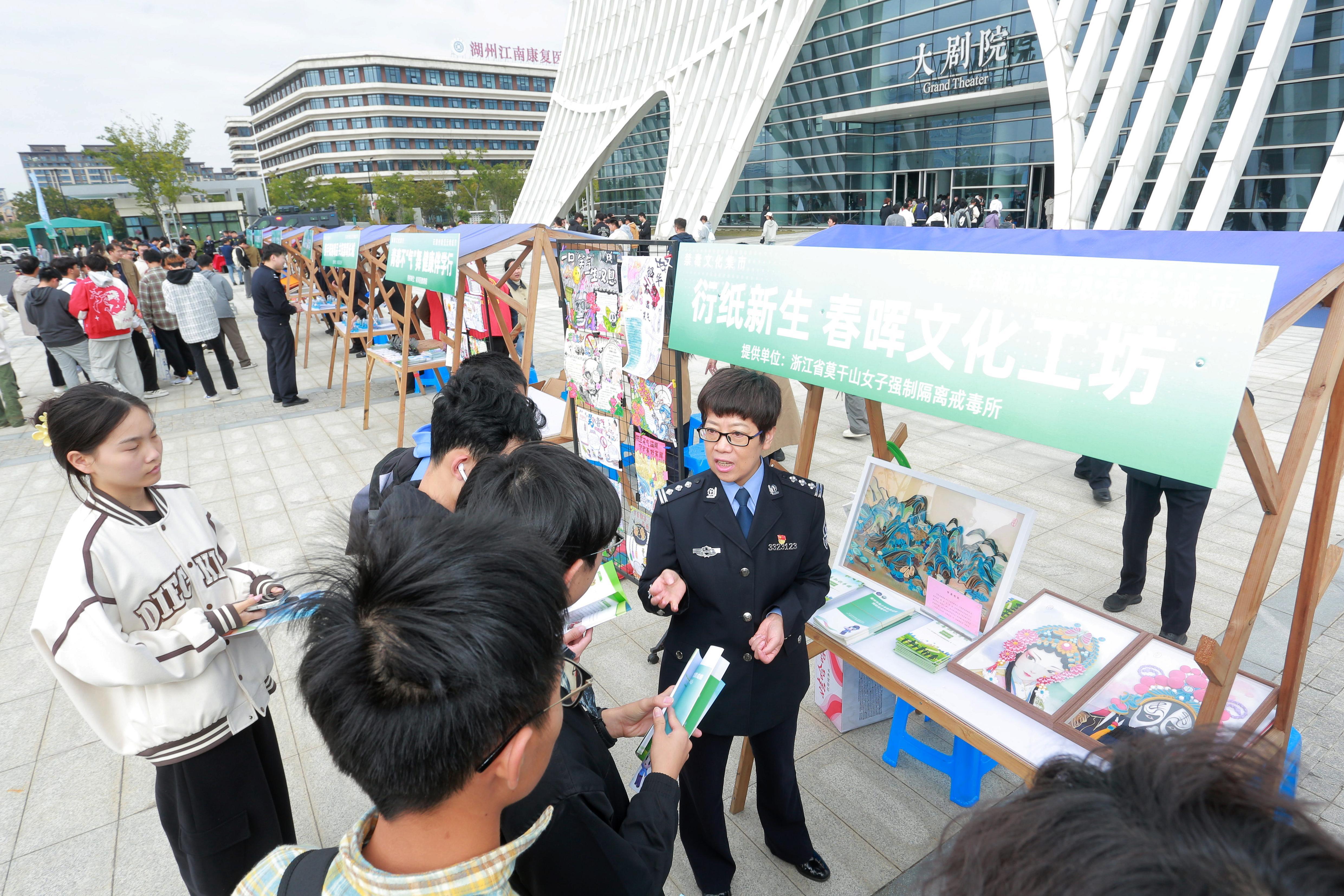 當(dāng)天,浙江水利水電學(xué)院大劇院前廣場的禁毒市集率先“開市”,巨型魔方禁毒logo醒目亮眼,創(chuàng)客大賽獲獎作品集中展出;市公安局特警支隊(duì)的緝毒犬現(xiàn)場表演“識毒絕技”,靈敏嗅覺引得師生陣陣驚嘆;“機(jī)器狗尋毒”演示展現(xiàn)科技禁毒新力量,南潯公安分局特警裝備與防暴車展示更讓師生直觀感受禁毒執(zhí)法硬實(shí)力。此外,湖州市南潯區(qū)公安分局、檢察院、法院、教育局、司法局等十余個(gè)禁毒職能部門設(shè)攤宣傳,通過“笑氣”模型展示、知識折頁發(fā)放、互動答疑等形式,將“笑氣”危害與防范知識傳遞給每一位參與者。