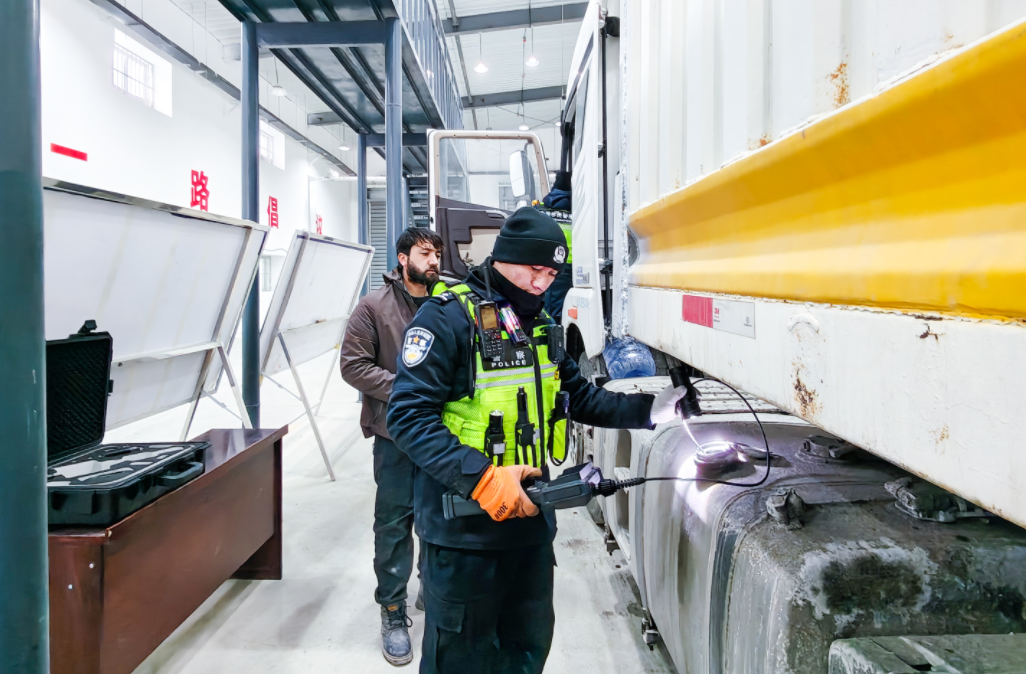 圖為執(zhí)勤民警在國(guó)門前查驗(yàn)出境貨車并進(jìn)行人證比對(duì)。