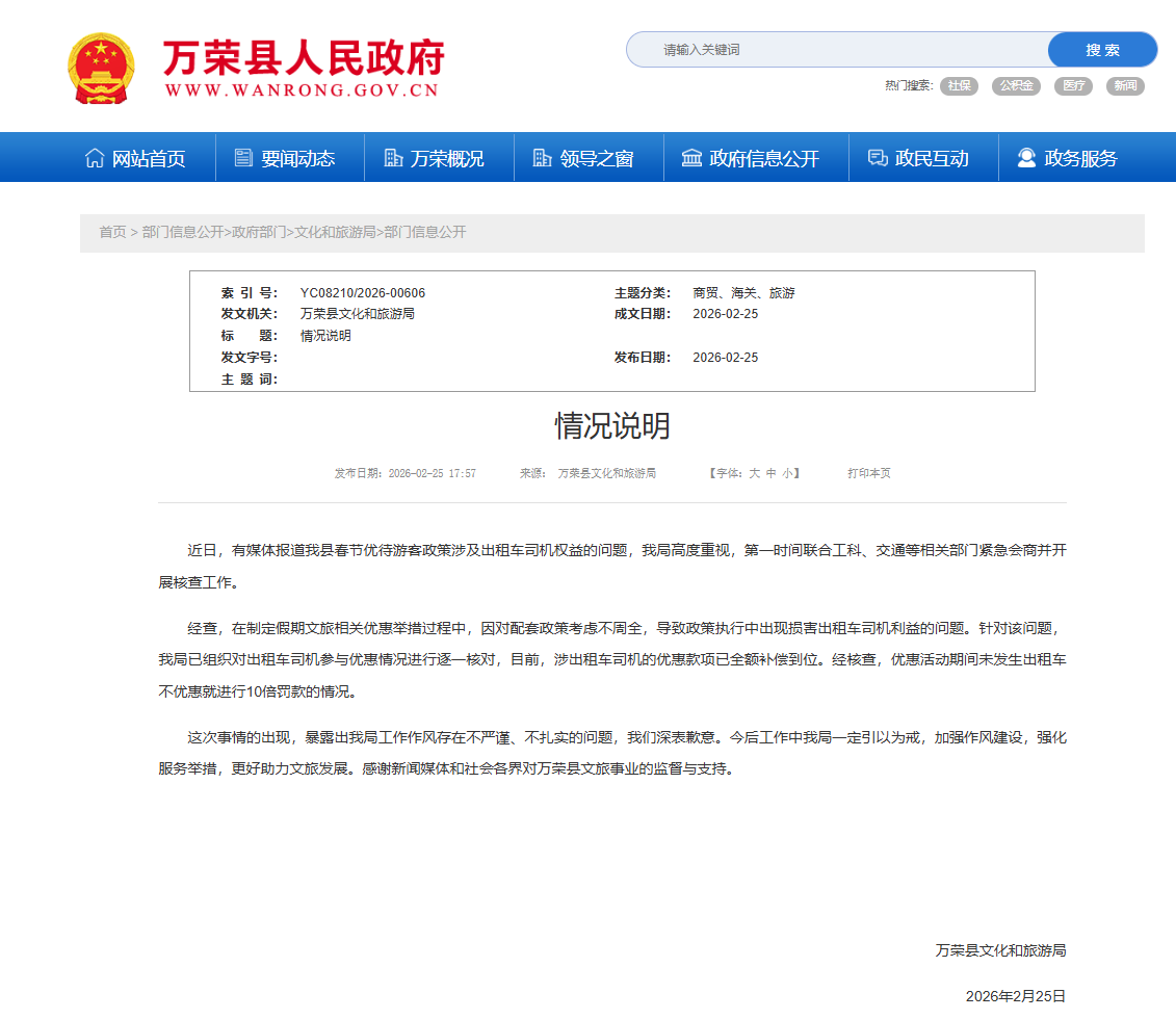 針對(duì)此事,2月25日,山西省萬(wàn)榮縣文旅局發(fā)布情況說(shuō)明: