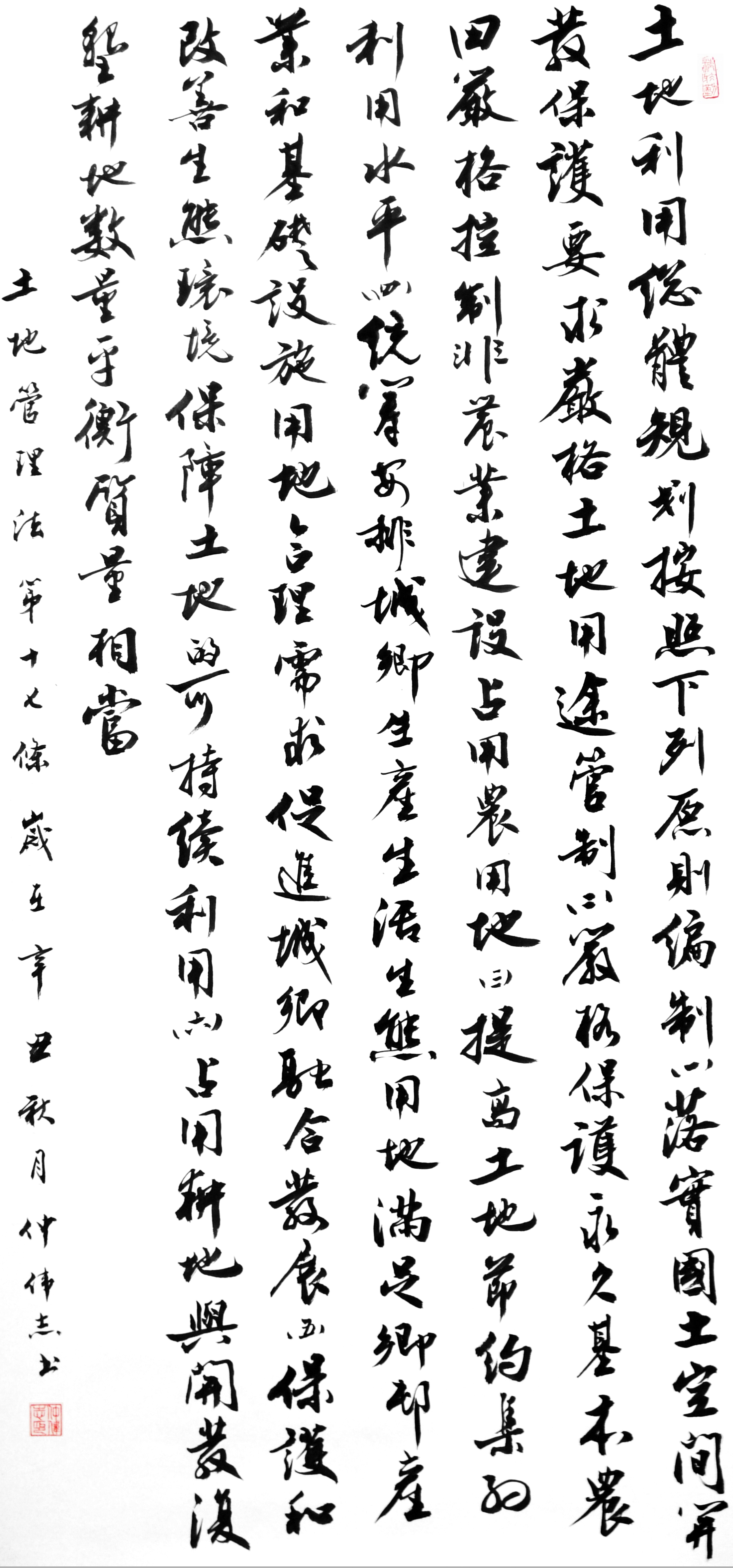 繼1600余位書法家參與書寫《中華人民共和國民法典》全部1260條法條之后,法治日報社聯(lián)合自然資源部法規(guī)司、自然資源部書畫研究會和北京昌平書法家協(xié)會,將筆端對準(zhǔn)土地管理“一法一條例”,即《中華人民共和國土地管理法》和《中華人民共和國土地管理法實施條例》。