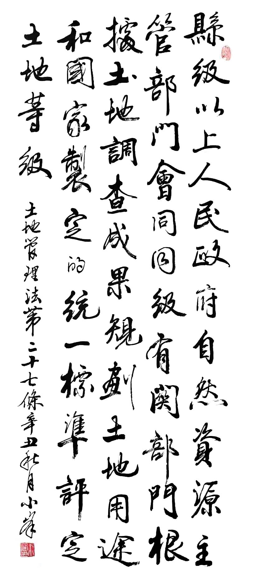 繼1600余位書法家參與書寫《中華人民共和國民法典》全部1260條法條之后,法治日?qǐng)?bào)社聯(lián)合自然資源部法規(guī)司、自然資源部書畫研究會(huì)和北京昌平書法家協(xié)會(huì),將筆端對(duì)準(zhǔn)土地管理“一法一條例”,即《中華人民共和國土地管理法》和《中華人民共和國土地管理法實(shí)施條例》。