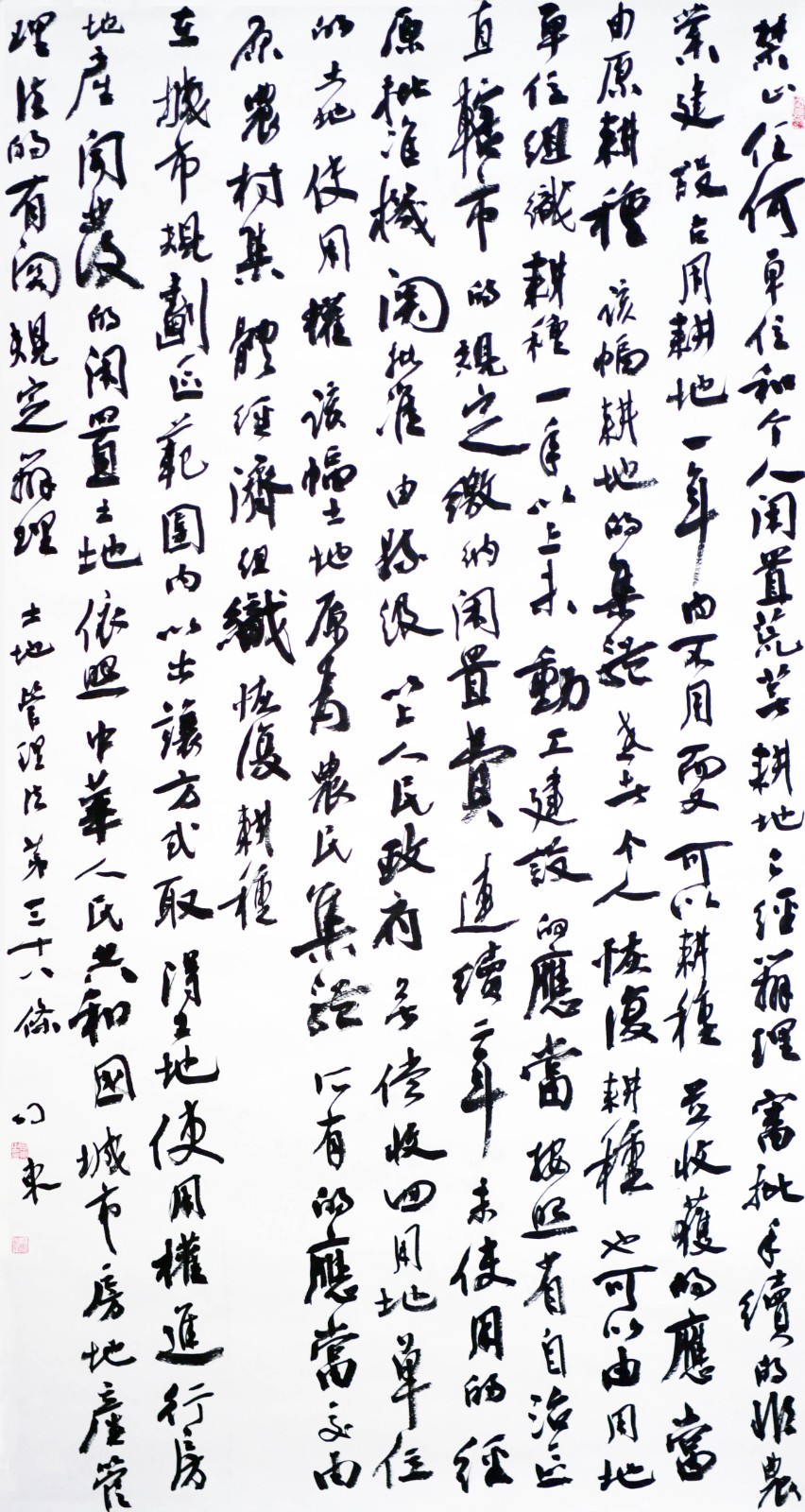 繼1600余位書法家參與書寫《中華人民共和國民法典》全部1260條法條之后,法治日報社聯(lián)合自然資源部法規(guī)司、自然資源部書畫研究會和北京昌平書法家協(xié)會,將筆端對準(zhǔn)土地管理“一法一條例”,即《中華人民共和國土地管理法》和《中華人民共和國土地管理法實(shí)施條例》。