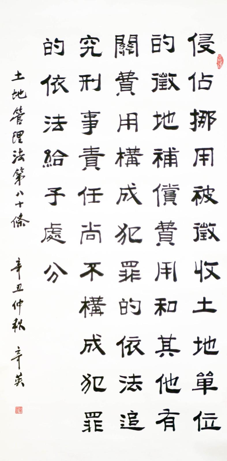 繼1600余位書(shū)法家參與書(shū)寫《中華人民共和國(guó)民法典》全部1260條法條之后,法治日?qǐng)?bào)社聯(lián)合自然資源部法規(guī)司、自然資源部書(shū)畫研究會(huì)和北京昌平書(shū)法家協(xié)會(huì),將筆端對(duì)準(zhǔn)土地管理“一法一條例”,即《中華人民共和國(guó)土地管理法》和《中華人民共和國(guó)土地管理法實(shí)施條例》。