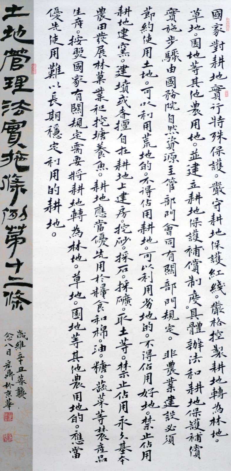繼1600余位書(shū)法家參與書(shū)寫(xiě)《中華人民共和國(guó)民法典》全部1260條法條之后,法治日?qǐng)?bào)社聯(lián)合自然資源部法規(guī)司、自然資源部書(shū)畫(huà)研究會(huì)和北京昌平書(shū)法家協(xié)會(huì),將筆端對(duì)準(zhǔn)土地管理“一法一條例”,即《中華人民共和國(guó)土地管理法》和《中華人民共和國(guó)土地管理法實(shí)施條例》。