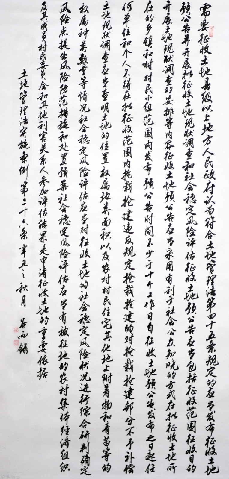 繼1600余位書法家參與書寫《中華人民共和國民法典》全部1260條法條之后,法治日報社聯(lián)合自然資源部法規(guī)司、自然資源部書畫研究會和北京昌平書法家協(xié)會,將筆端對準土地管理“一法一條例”,即《中華人民共和國土地管理法》和《中華人民共和國土地管理法實施條例》。