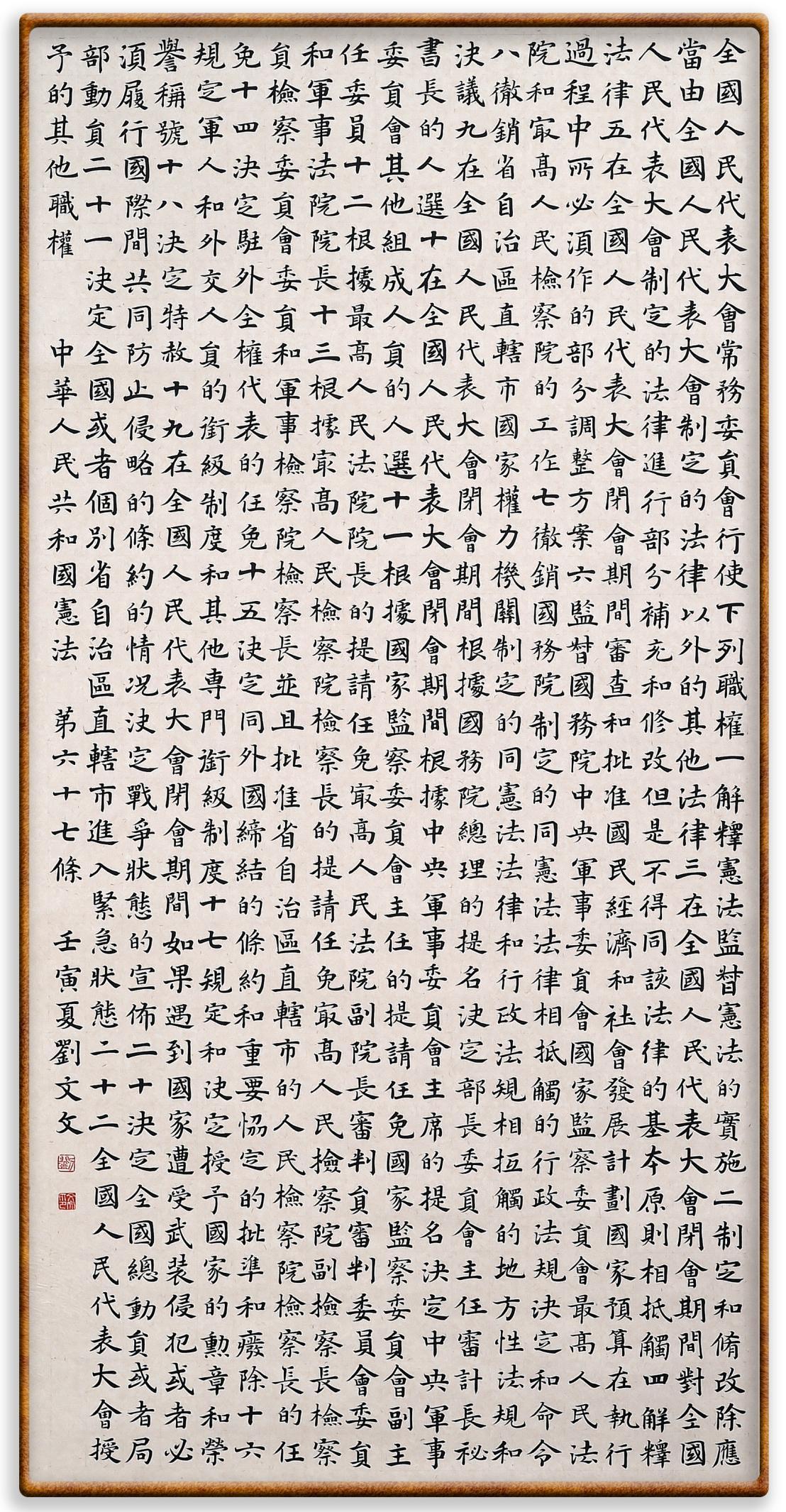 繼《中華人民共和國(guó)民法典》《中華人民共和國(guó)土地管理法》《中華人民共和國(guó)土地管理法實(shí)施條例》《中華人民共和國(guó)法律援助法》之后,法治日?qǐng)?bào)社聯(lián)合北京市司法局、北京書(shū)法家協(xié)會(huì),將筆端對(duì)準(zhǔn)《中華人民共和國(guó)憲法》和《中華人民共和國(guó)行政處罰法》。