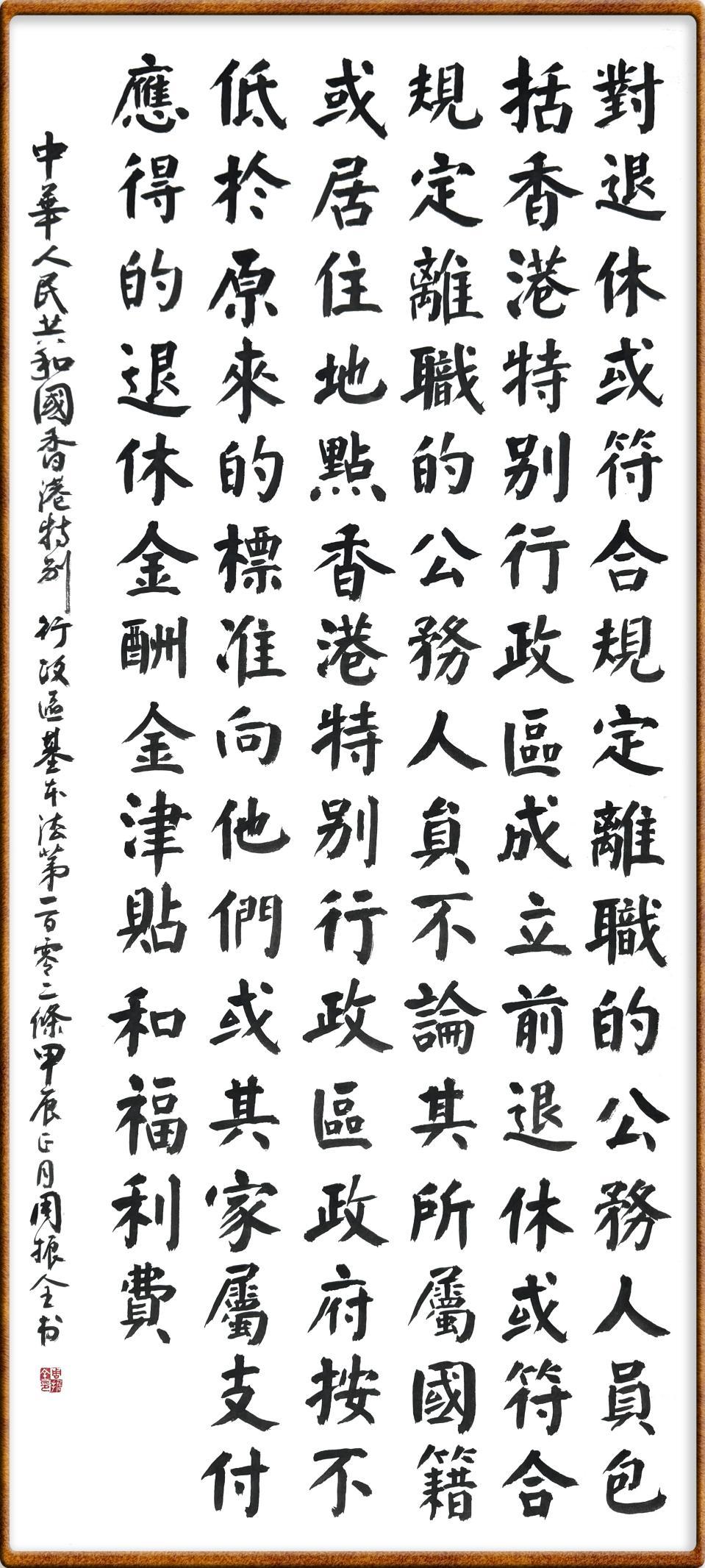 香港基本法第一百零二條 對退休或符合規(guī)定離職的公務(wù)人員,包括香港特別行政區(qū)成立前退休或符合規(guī)定離職的公務(wù)人員,不論其所屬國籍或居住地點(diǎn),香港特別行政區(qū)政府按不低于原來的標(biāo)準(zhǔn)向他們或其家屬支付應(yīng)得的退休金、酬金、津貼和福利費(fèi)。