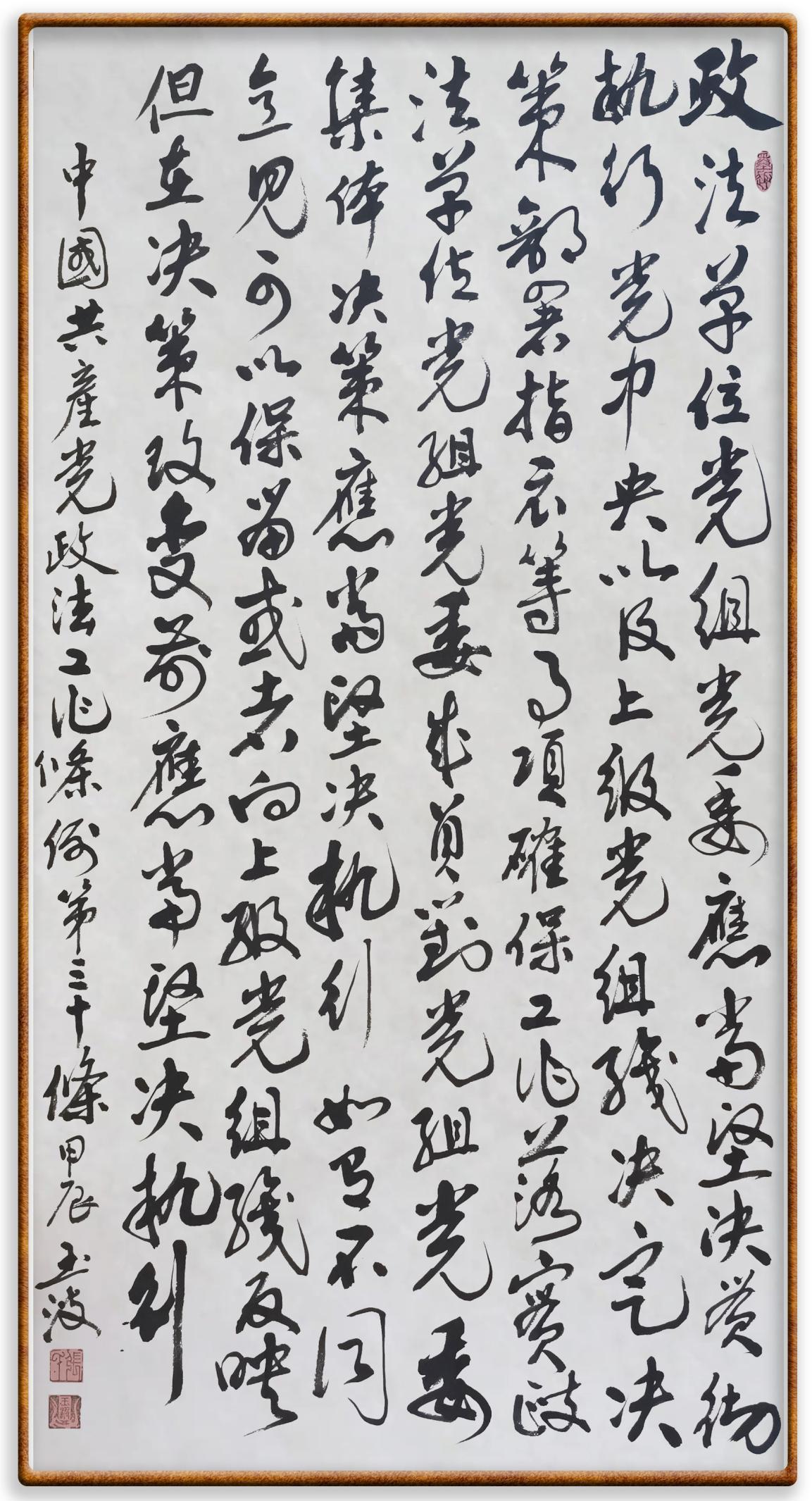《中國共產(chǎn)黨政法工作條例》對黨領導新時代政法工作進行全面制度擘畫,為黨領導政法工作提供基本遵循,具有重大而深遠的意義。為學習好、宣傳好、貫徹好、實施好這部黨內(nèi)法規(guī),繼《中華人民共和國民法典》《中華人民共和國憲法》《信訪工作條例》《中華人民共和國澳門特別行政區(qū)基本法》《中華人民共和國香港特別行政區(qū)基本法》等法律法規(guī)之后,“書·法”系列活動將筆端對準《中國共產(chǎn)黨政法工作條例》。