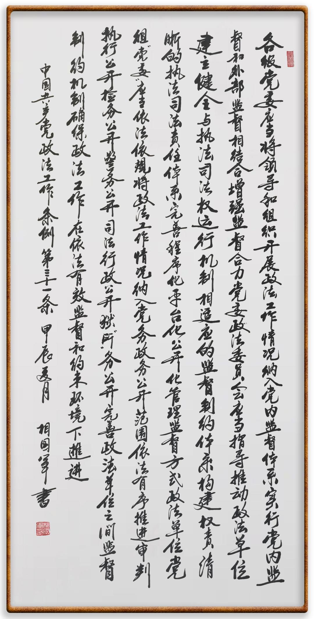 《中國共產(chǎn)黨政法工作條例》對黨領(lǐng)導(dǎo)新時代政法工作進(jìn)行全面制度擘畫,為黨領(lǐng)導(dǎo)政法工作提供基本遵循,具有重大而深遠(yuǎn)的意義。為學(xué)習(xí)好、宣傳好、貫徹好、實(shí)施好這部黨內(nèi)法規(guī),繼《中華人民共和國民法典》《中華人民共和國憲法》《信訪工作條例》《中華人民共和國澳門特別行政區(qū)基本法》《中華人民共和國香港特別行政區(qū)基本法》等法律法規(guī)之后,“書·法”系列活動將筆端對準(zhǔn)《中國共產(chǎn)黨政法工作條例》。