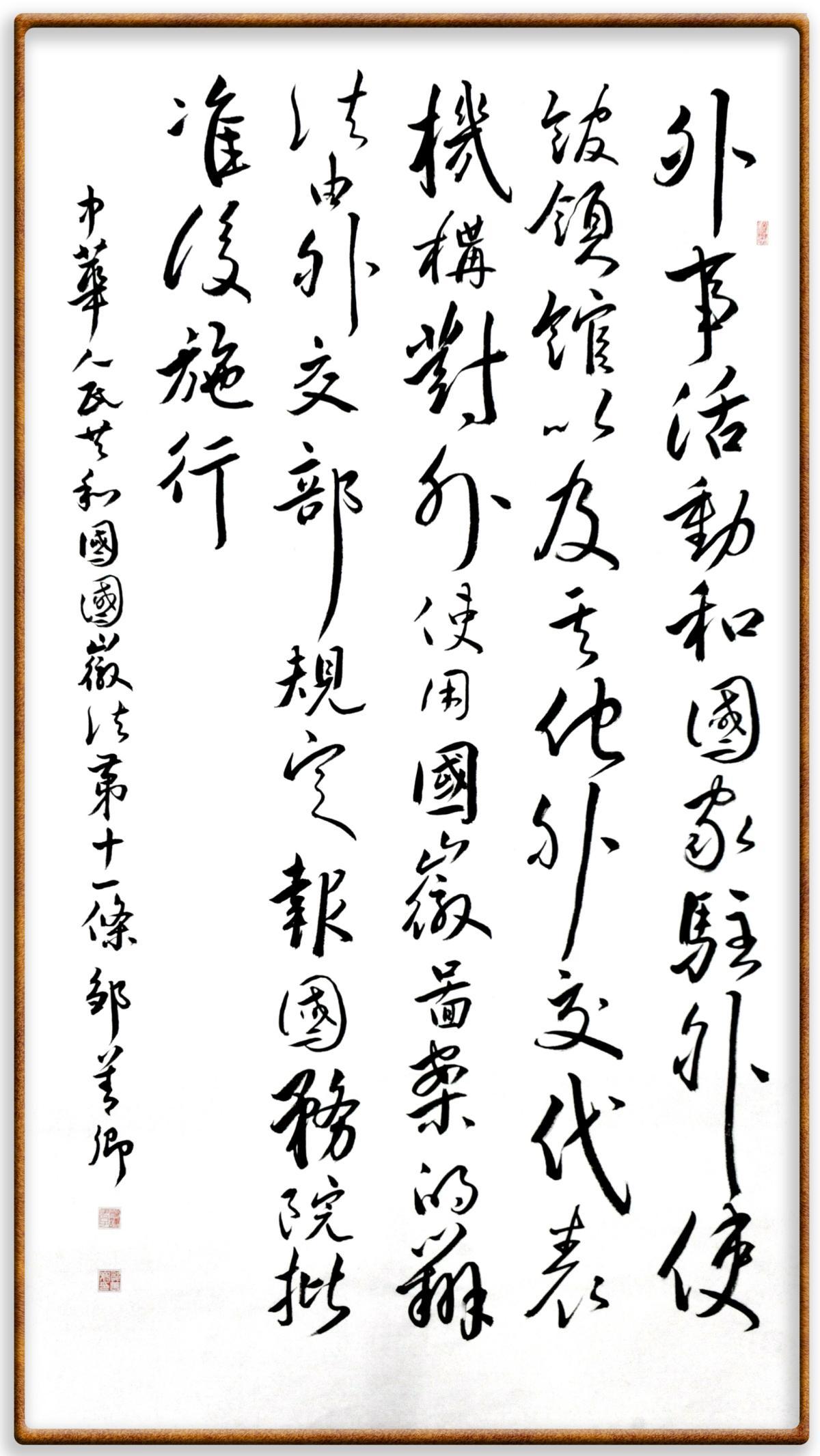 國徽法第十一條 外事活動和國家駐外使館、領(lǐng)館以及其他外交代表機(jī)構(gòu)對外使用國徽圖案的辦法,由外交部規(guī)定,報(bào)國務(wù)院批準(zhǔn)后施行。