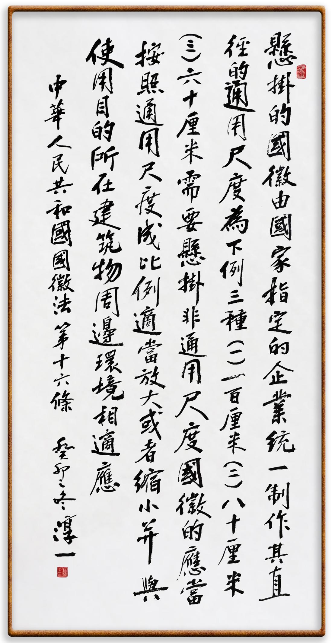 需要懸掛非通用尺度國(guó)徽的,應(yīng)當(dāng)按照通用尺度成比例適當(dāng)放大或者縮小,并與使用目的、所在建筑物、周邊環(huán)境相適應(yīng)。