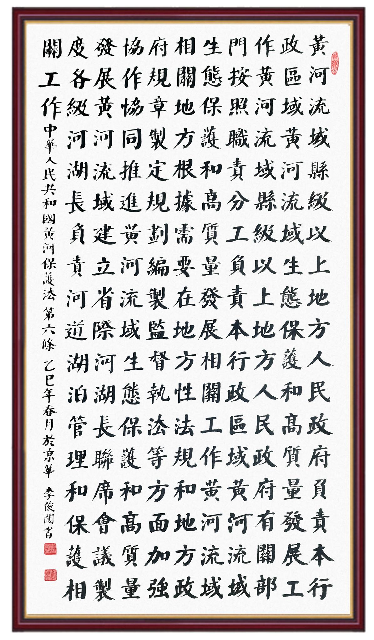 黃河寧,天下平。黃河是中華民族的發(fā)源地和搖籃,保護(hù)黃河是事關(guān)中華民族偉大復(fù)興的千秋大計。《中華人民共和國黃河保護(hù)法》為推進(jìn)水資源節(jié)約集約利用、保護(hù)傳承弘揚(yáng)黃河文化、推動黃河流域生態(tài)保護(hù)和高質(zhì)量發(fā)展提供了有力法治保障。繼書寫《中華人民共和國民法典》《中華人民共和國憲法》《中華人民共和國澳門特別行政區(qū)基本法》《中華人民共和國香港特別行政區(qū)基本法》《中華人民共和國國旗法》《中華人民共和國國徽法》《中華人民共和國國歌法》《中華人民共和國法官法》等法律法規(guī)之后,法制日報社聯(lián)合沿黃九?。▍^(qū))司法廳、書法家協(xié)會,將筆端對準(zhǔn)《中華人民共和國黃河保護(hù)法》。