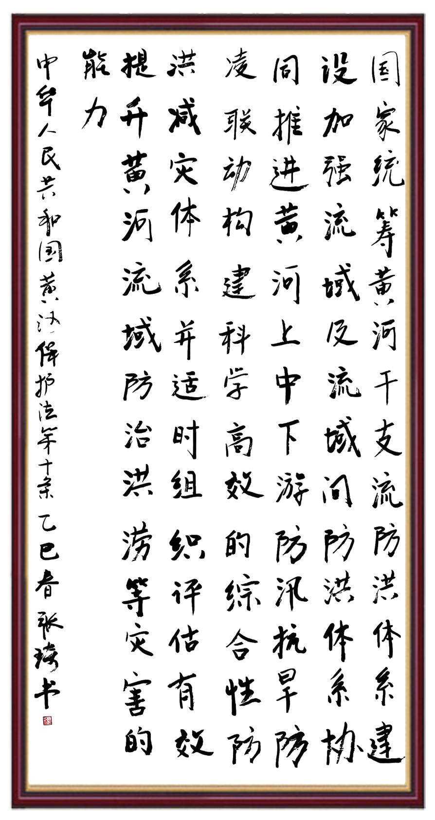 黃河寧,天下平。黃河是中華民族的發(fā)源地和搖籃,保護(hù)黃河是事關(guān)中華民族偉大復(fù)興的千秋大計(jì)。《中華人民共和國(guó)黃河保護(hù)法》為推進(jìn)水資源節(jié)約集約利用、保護(hù)傳承弘揚(yáng)黃河文化、推動(dòng)黃河流域生態(tài)保護(hù)和高質(zhì)量發(fā)展提供了有力法治保障。繼書寫《中華人民共和國(guó)民法典》《中華人民共和國(guó)憲法》《中華人民共和國(guó)澳門特別行政區(qū)基本法》《中華人民共和國(guó)香港特別行政區(qū)基本法》《中華人民共和國(guó)國(guó)旗法》《中華人民共和國(guó)國(guó)徽法》《中華人民共和國(guó)國(guó)歌法》《中華人民共和國(guó)法官法》等法律法規(guī)之后,法制日?qǐng)?bào)社聯(lián)合沿黃九?。▍^(qū))司法廳、書法家協(xié)會(huì),將筆端對(duì)準(zhǔn)《中華人民共和國(guó)黃河保護(hù)法》。