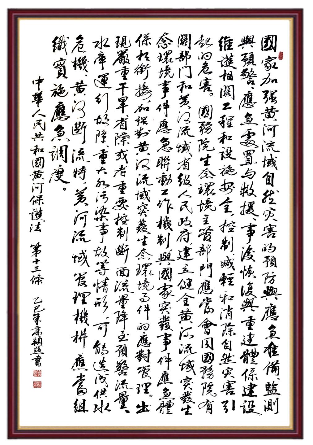 黃河寧,天下平。黃河是中華民族的發(fā)源地和搖籃,保護黃河是事關中華民族偉大復興的千秋大計?!吨腥A人民共和國黃河保護法》為推進水資源節(jié)約集約利用、保護傳承弘揚黃河文化、推動黃河流域生態(tài)保護和高質量發(fā)展提供了有力法治保障。繼書寫《中華人民共和國民法典》《中華人民共和國憲法》《中華人民共和國澳門特別行政區(qū)基本法》《中華人民共和國香港特別行政區(qū)基本法》《中華人民共和國國旗法》《中華人民共和國國徽法》《中華人民共和國國歌法》《中華人民共和國法官法》等法律法規(guī)之后,法制日報社聯(lián)合沿黃九?。▍^(qū))司法廳、書法家協(xié)會,將筆端對準《中華人民共和國黃河保護法》。
