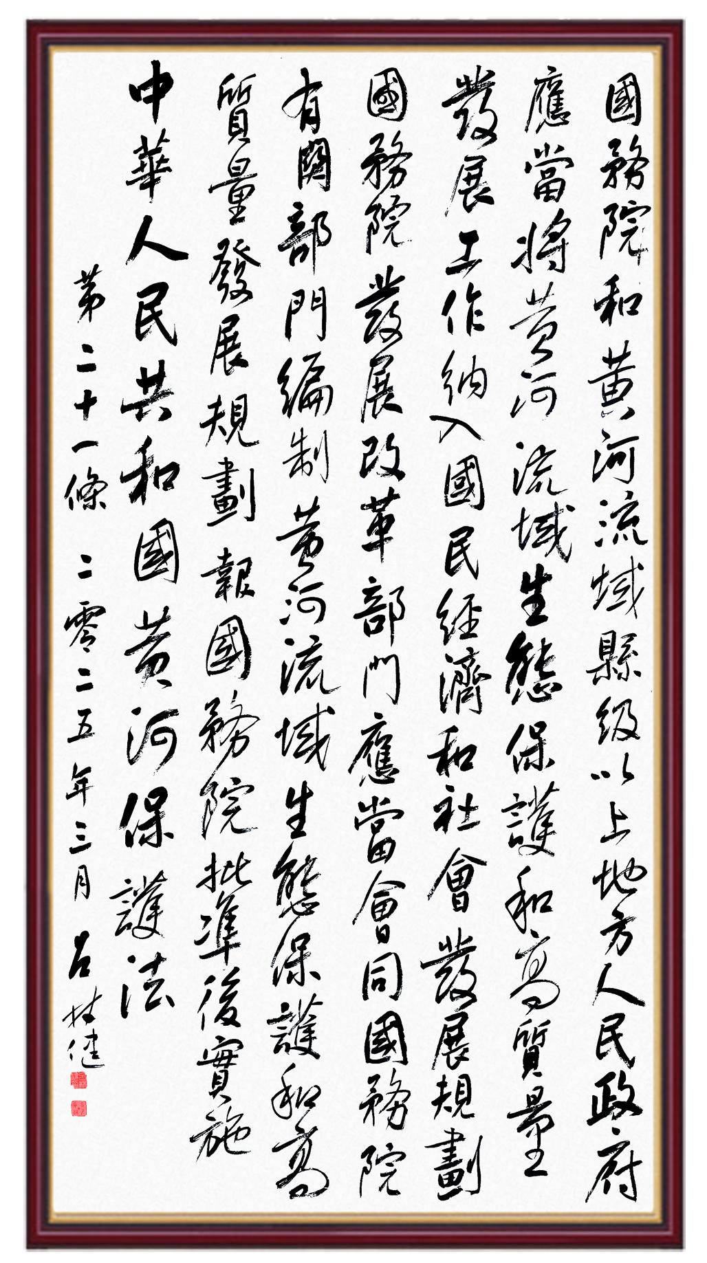 黃河寧,天下平。黃河是中華民族的發(fā)源地和搖籃,保護(hù)黃河是事關(guān)中華民族偉大復(fù)興的千秋大計(jì)?!吨腥A人民共和國(guó)黃河保護(hù)法》為推進(jìn)水資源節(jié)約集約利用、保護(hù)傳承弘揚(yáng)黃河文化、推動(dòng)黃河流域生態(tài)保護(hù)和高質(zhì)量發(fā)展提供了有力法治保障。繼書寫《中華人民共和國(guó)民法典》《中華人民共和國(guó)憲法》《中華人民共和國(guó)澳門特別行政區(qū)基本法》《中華人民共和國(guó)香港特別行政區(qū)基本法》《中華人民共和國(guó)國(guó)旗法》《中華人民共和國(guó)國(guó)徽法》《中華人民共和國(guó)國(guó)歌法》《中華人民共和國(guó)法官法》等法律法規(guī)之后,法制日?qǐng)?bào)社聯(lián)合沿黃九?。▍^(qū))司法廳、書法家協(xié)會(huì),將筆端對(duì)準(zhǔn)《中華人民共和國(guó)黃河保護(hù)法》。