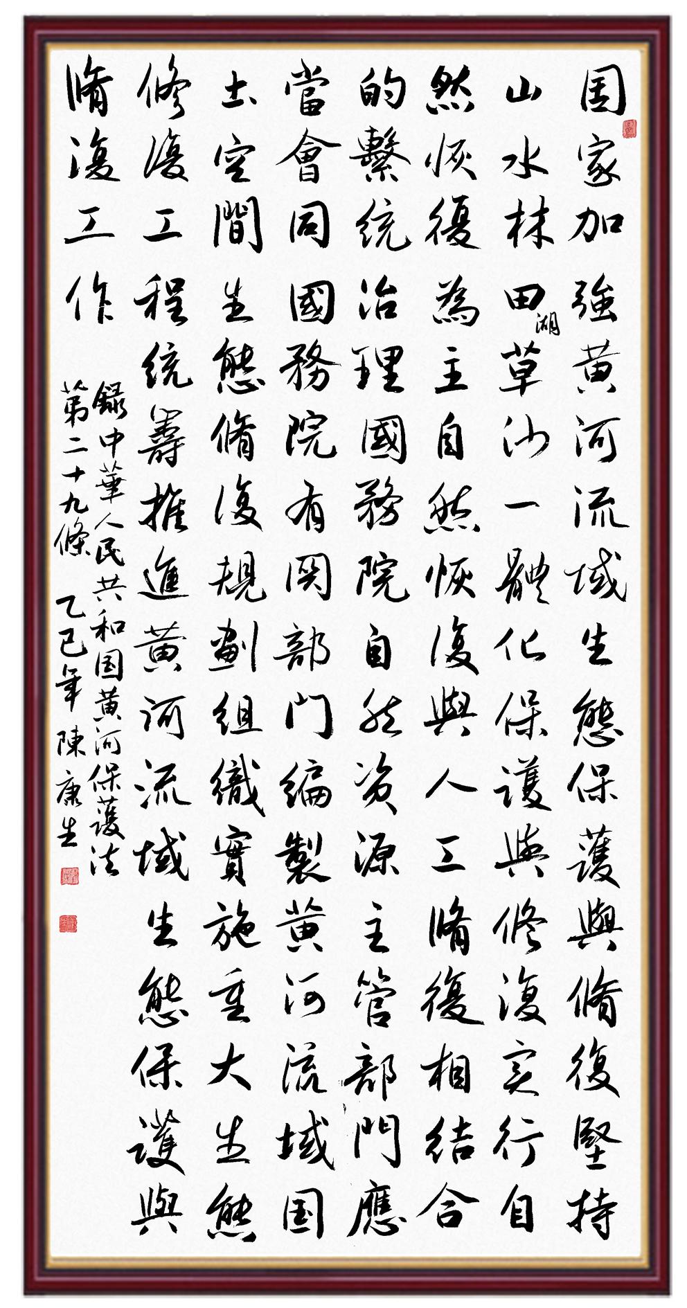 黃河寧,天下平。黃河是中華民族的發(fā)源地和搖籃,保護(hù)黃河是事關(guān)中華民族偉大復(fù)興的千秋大計(jì)?!吨腥A人民共和國(guó)黃河保護(hù)法》為推進(jìn)水資源節(jié)約集約利用、保護(hù)傳承弘揚(yáng)黃河文化、推動(dòng)黃河流域生態(tài)保護(hù)和高質(zhì)量發(fā)展提供了有力法治保障。繼書(shū)寫(xiě)《中華人民共和國(guó)民法典》《中華人民共和國(guó)憲法》《中華人民共和國(guó)澳門(mén)特別行政區(qū)基本法》《中華人民共和國(guó)香港特別行政區(qū)基本法》《中華人民共和國(guó)國(guó)旗法》《中華人民共和國(guó)國(guó)徽法》《中華人民共和國(guó)國(guó)歌法》《中華人民共和國(guó)法官法》等法律法規(guī)之后,法制日?qǐng)?bào)社聯(lián)合沿黃九省(區(qū))司法廳、書(shū)法家協(xié)會(huì),將筆端對(duì)準(zhǔn)《中華人民共和國(guó)黃河保護(hù)法》。