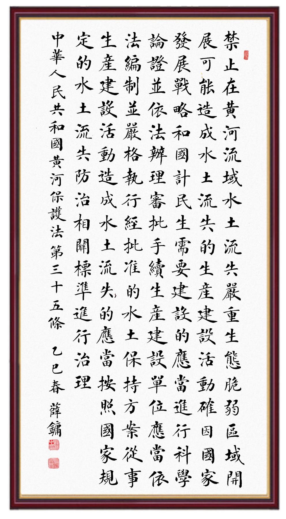 黃河寧,天下平。黃河是中華民族的發(fā)源地和搖籃,保護(hù)黃河是事關(guān)中華民族偉大復(fù)興的千秋大計(jì)?!吨腥A人民共和國黃河保護(hù)法》為推進(jìn)水資源節(jié)約集約利用、保護(hù)傳承弘揚(yáng)黃河文化、推動(dòng)黃河流域生態(tài)保護(hù)和高質(zhì)量發(fā)展提供了有力法治保障。繼書寫《中華人民共和國民法典》《中華人民共和國憲法》《中華人民共和國澳門特別行政區(qū)基本法》《中華人民共和國香港特別行政區(qū)基本法》《中華人民共和國國旗法》《中華人民共和國國徽法》《中華人民共和國國歌法》《中華人民共和國法官法》等法律法規(guī)之后,法制日報(bào)社聯(lián)合沿黃九?。▍^(qū))司法廳、書法家協(xié)會,將筆端對準(zhǔn)《中華人民共和國黃河保護(hù)法》。