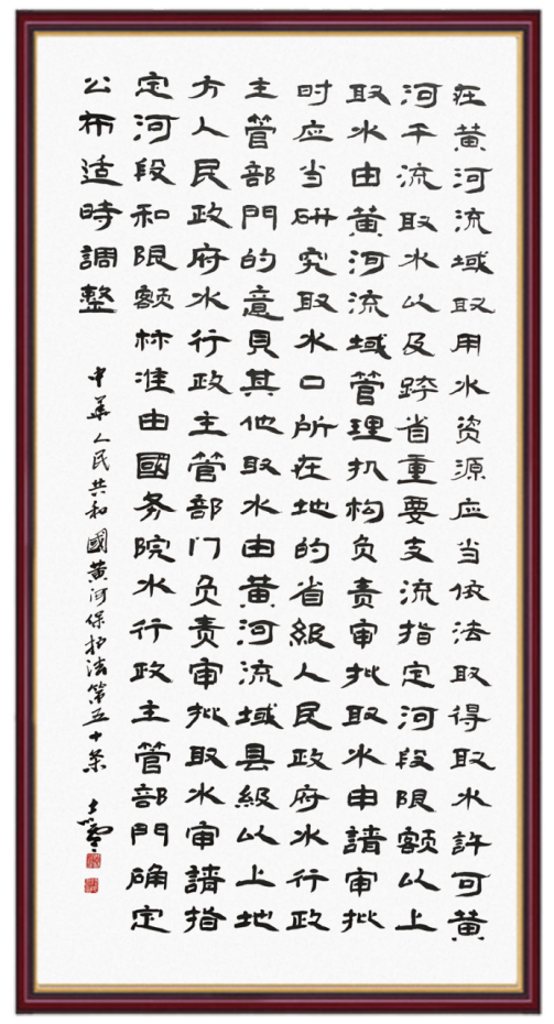 黃河寧,天下平。黃河是中華民族的發(fā)源地和搖籃,保護黃河是事關中華民族偉大復興的千秋大計。《中華人民共和國黃河保護法》為推進水資源節(jié)約集約利用、保護傳承弘揚黃河文化、推動黃河流域生態(tài)保護和高質量發(fā)展提供了有力法治保障。繼書寫《中華人民共和國民法典》《中華人民共和國憲法》《中華人民共和國澳門特別行政區(qū)基本法》《中華人民共和國香港特別行政區(qū)基本法》《中華人民共和國國旗法》《中華人民共和國國徽法》《中華人民共和國國歌法》《中華人民共和國法官法》等法律法規(guī)之后,法制日報社聯(lián)合沿黃九?。▍^(qū))司法廳、書法家協(xié)會,將筆端對準《中華人民共和國黃河保護法》。