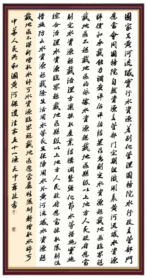 黃河寧,天下平。黃河是中華民族的發(fā)源地和搖籃,保護(hù)黃河是事關(guān)中華民族偉大復(fù)興的千秋大計(jì)?!吨腥A人民共和國黃河保護(hù)法》為推進(jìn)水資源節(jié)約集約利用、保護(hù)傳承弘揚(yáng)黃河文化、推動黃河流域生態(tài)保護(hù)和高質(zhì)量發(fā)展提供了有力法治保障。繼書寫《中華人民共和國民法典》《中華人民共和國憲法》《中華人民共和國澳門特別行政區(qū)基本法》《中華人民共和國香港特別行政區(qū)基本法》《中華人民共和國國旗法》《中華人民共和國國徽法》《中華人民共和國國歌法》《中華人民共和國法官法》等法律法規(guī)之后,法制日報(bào)社聯(lián)合沿黃九?。▍^(qū))司法廳、書法家協(xié)會,將筆端對準(zhǔn)《中華人民共和國黃河保護(hù)法》。