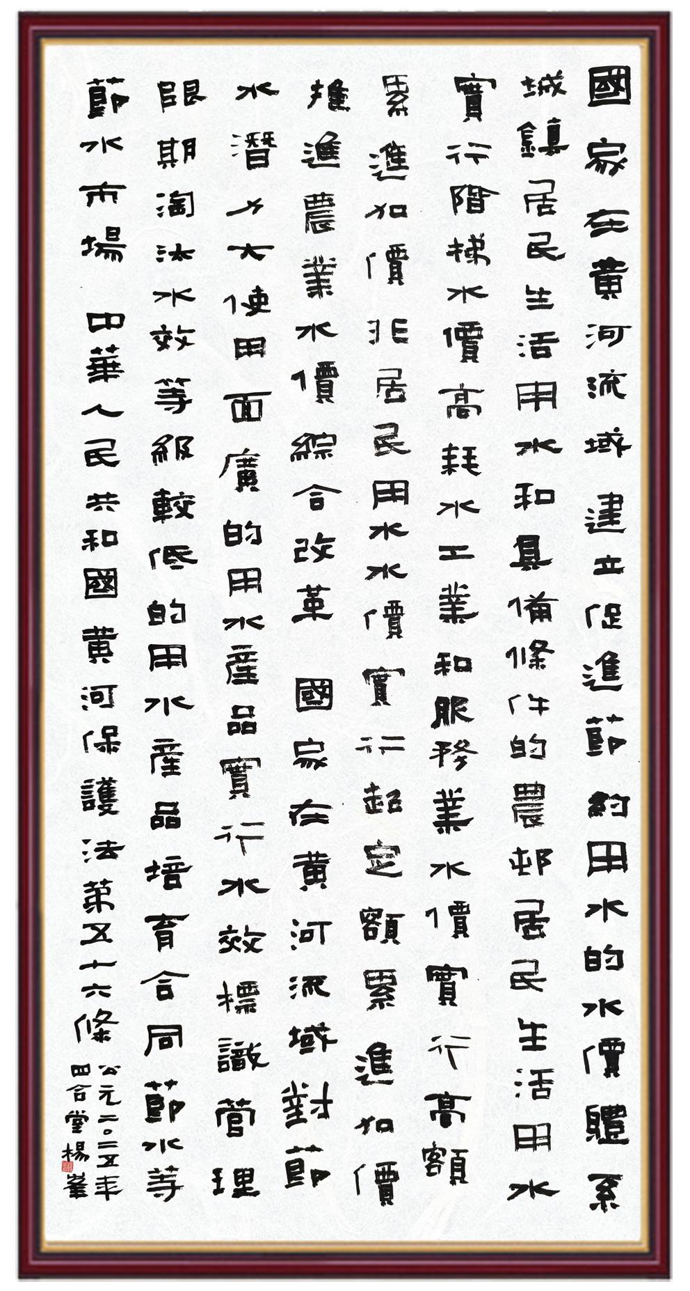 黃河寧,天下平。黃河是中華民族的發(fā)源地和搖籃,保護黃河是事關中華民族偉大復興的千秋大計?!吨腥A人民共和國黃河保護法》為推進水資源節(jié)約集約利用、保護傳承弘揚黃河文化、推動黃河流域生態(tài)保護和高質量發(fā)展提供了有力法治保障。繼書寫《中華人民共和國民法典》《中華人民共和國憲法》《中華人民共和國澳門特別行政區(qū)基本法》《中華人民共和國香港特別行政區(qū)基本法》《中華人民共和國國旗法》《中華人民共和國國徽法》《中華人民共和國國歌法》《中華人民共和國法官法》等法律法規(guī)之后,法制日報社聯(lián)合沿黃九省(區(qū))司法廳、書法家協(xié)會,將筆端對準《中華人民共和國黃河保護法》。