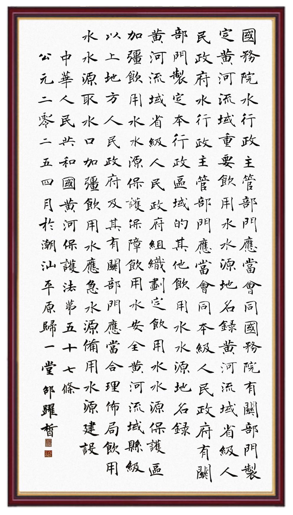 黃河寧,天下平。黃河是中華民族的發(fā)源地和搖籃,保護(hù)黃河是事關(guān)中華民族偉大復(fù)興的千秋大計。《中華人民共和國黃河保護(hù)法》為推進(jìn)水資源節(jié)約集約利用、保護(hù)傳承弘揚黃河文化、推動黃河流域生態(tài)保護(hù)和高質(zhì)量發(fā)展提供了有力法治保障。繼書寫《中華人民共和國民法典》《中華人民共和國憲法》《中華人民共和國澳門特別行政區(qū)基本法》《中華人民共和國香港特別行政區(qū)基本法》《中華人民共和國國旗法》《中華人民共和國國徽法》《中華人民共和國國歌法》《中華人民共和國法官法》等法律法規(guī)之后,法制日報社聯(lián)合沿黃九?。▍^(qū))司法廳、書法家協(xié)會,將筆端對準(zhǔn)《中華人民共和國黃河保護(hù)法》。