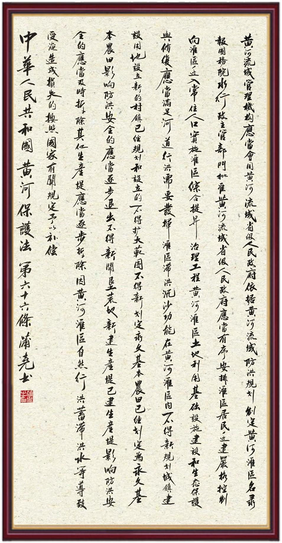 黃河寧,天下平。黃河是中華民族的發(fā)源地和搖籃,保護(hù)黃河是事關(guān)中華民族偉大復(fù)興的千秋大計(jì)?!吨腥A人民共和國(guó)黃河保護(hù)法》為推進(jìn)水資源節(jié)約集約利用、保護(hù)傳承弘揚(yáng)黃河文化、推動(dòng)黃河流域生態(tài)保護(hù)和高質(zhì)量發(fā)展提供了有力法治保障。繼書(shū)寫(xiě)《中華人民共和國(guó)民法典》《中華人民共和國(guó)憲法》《中華人民共和國(guó)澳門(mén)特別行政區(qū)基本法》《中華人民共和國(guó)香港特別行政區(qū)基本法》《中華人民共和國(guó)國(guó)旗法》《中華人民共和國(guó)國(guó)徽法》《中華人民共和國(guó)國(guó)歌法》《中華人民共和國(guó)法官法》等法律法規(guī)之后,法制日?qǐng)?bào)社聯(lián)合沿黃九省(區(qū))司法廳、書(shū)法家協(xié)會(huì),將筆端對(duì)準(zhǔn)《中華人民共和國(guó)黃河保護(hù)法》。