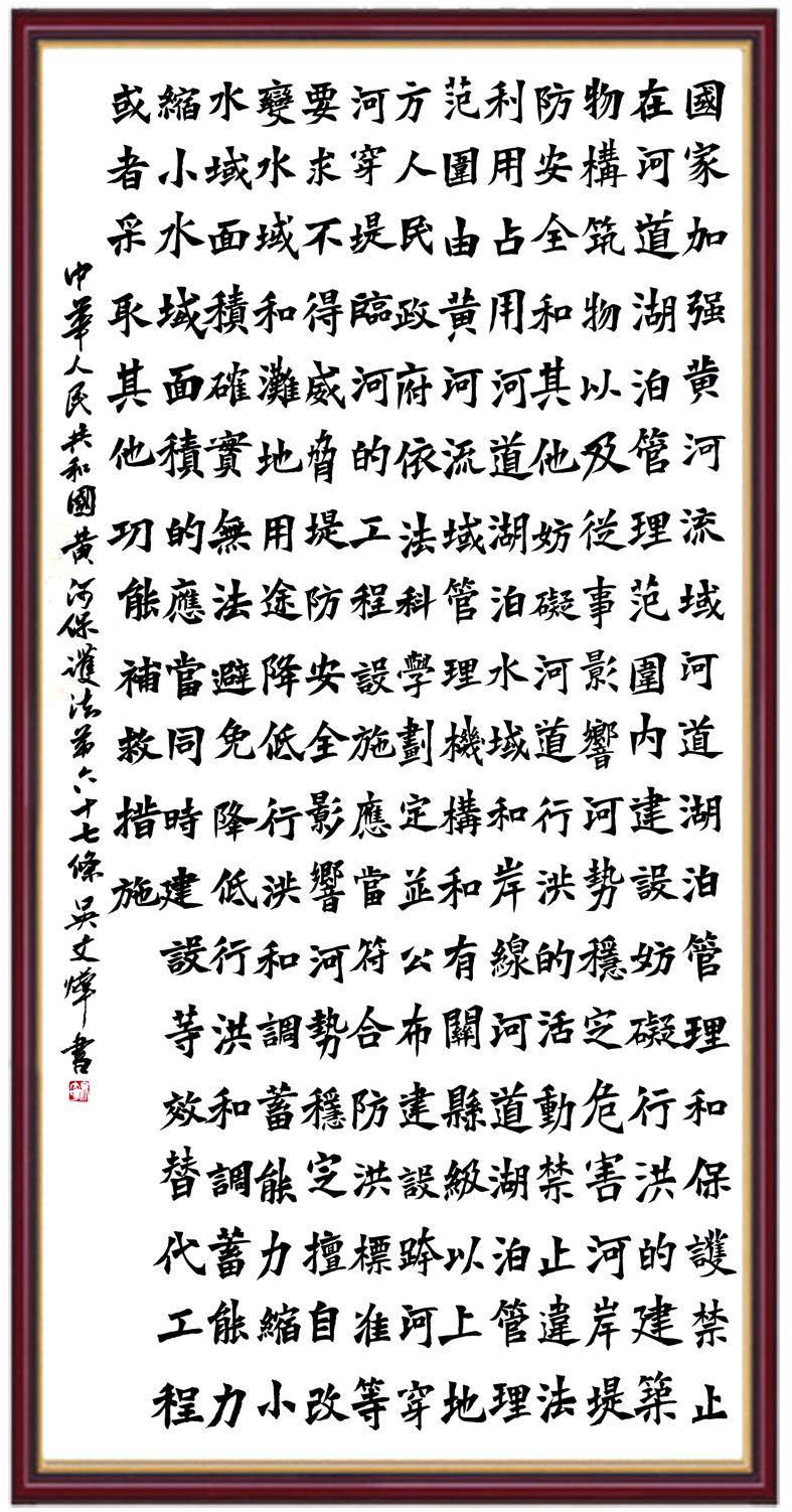 黃河寧,天下平。黃河是中華民族的發(fā)源地和搖籃,保護(hù)黃河是事關(guān)中華民族偉大復(fù)興的千秋大計?!吨腥A人民共和國黃河保護(hù)法》為推進(jìn)水資源節(jié)約集約利用、保護(hù)傳承弘揚(yáng)黃河文化、推動黃河流域生態(tài)保護(hù)和高質(zhì)量發(fā)展提供了有力法治保障。繼書寫《中華人民共和國民法典》《中華人民共和國憲法》《中華人民共和國澳門特別行政區(qū)基本法》《中華人民共和國香港特別行政區(qū)基本法》《中華人民共和國國旗法》《中華人民共和國國徽法》《中華人民共和國國歌法》《中華人民共和國法官法》等法律法規(guī)之后,法制日報社聯(lián)合沿黃九?。▍^(qū))司法廳、書法家協(xié)會,將筆端對準(zhǔn)《中華人民共和國黃河保護(hù)法》。