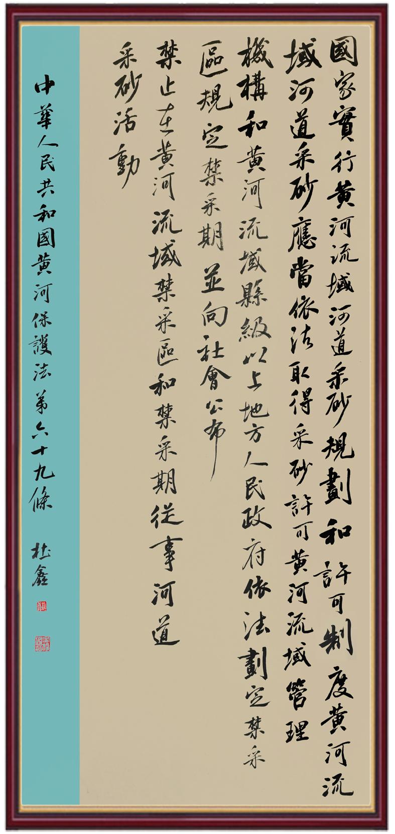 黃河寧,天下平。黃河是中華民族的發(fā)源地和搖籃,保護黃河是事關(guān)中華民族偉大復(fù)興的千秋大計?!吨腥A人民共和國黃河保護法》為推進水資源節(jié)約集約利用、保護傳承弘揚黃河文化、推動黃河流域生態(tài)保護和高質(zhì)量發(fā)展提供了有力法治保障。繼書寫《中華人民共和國民法典》《中華人民共和國憲法》《中華人民共和國澳門特別行政區(qū)基本法》《中華人民共和國香港特別行政區(qū)基本法》《中華人民共和國國旗法》《中華人民共和國國徽法》《中華人民共和國國歌法》《中華人民共和國法官法》等法律法規(guī)之后,法制日報社聯(lián)合沿黃九?。▍^(qū))司法廳、書法家協(xié)會,將筆端對準(zhǔn)《中華人民共和國黃河保護法》。