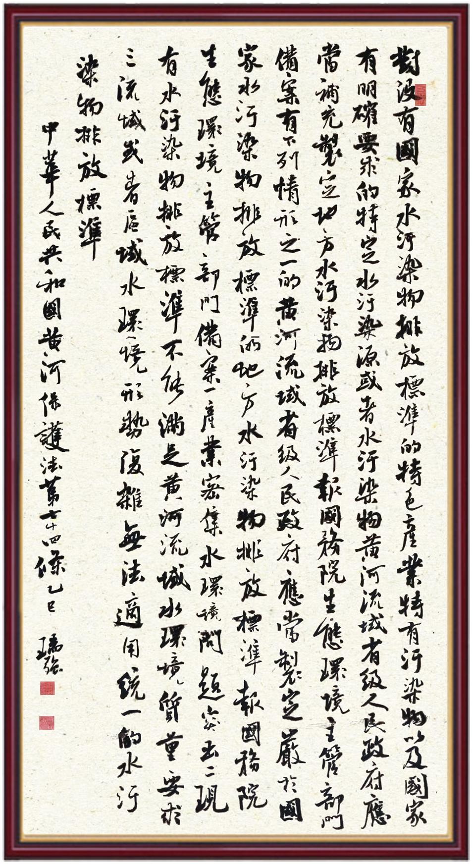 黃河寧,天下平。黃河是中華民族的發(fā)源地和搖籃,保護(hù)黃河是事關(guān)中華民族偉大復(fù)興的千秋大計(jì)?!吨腥A人民共和國(guó)黃河保護(hù)法》為推進(jìn)水資源節(jié)約集約利用、保護(hù)傳承弘揚(yáng)黃河文化、推動(dòng)黃河流域生態(tài)保護(hù)和高質(zhì)量發(fā)展提供了有力法治保障。繼書寫《中華人民共和國(guó)民法典》《中華人民共和國(guó)憲法》《中華人民共和國(guó)澳門特別行政區(qū)基本法》《中華人民共和國(guó)香港特別行政區(qū)基本法》《中華人民共和國(guó)國(guó)旗法》《中華人民共和國(guó)國(guó)徽法》《中華人民共和國(guó)國(guó)歌法》《中華人民共和國(guó)法官法》等法律法規(guī)之后,法制日?qǐng)?bào)社聯(lián)合沿黃九?。▍^(qū))司法廳、書法家協(xié)會(huì),將筆端對(duì)準(zhǔn)《中華人民共和國(guó)黃河保護(hù)法》。