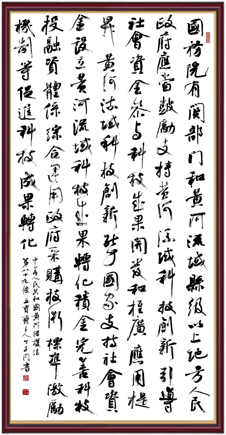 黃河寧,天下平。黃河是中華民族的發(fā)源地和搖籃,保護(hù)黃河是事關(guān)中華民族偉大復(fù)興的千秋大計(jì)?!吨腥A人民共和國(guó)黃河保護(hù)法》為推進(jìn)水資源節(jié)約集約利用、保護(hù)傳承弘揚(yáng)黃河文化、推動(dòng)黃河流域生態(tài)保護(hù)和高質(zhì)量發(fā)展提供了有力法治保障。繼書(shū)寫(xiě)《中華人民共和國(guó)民法典》《中華人民共和國(guó)憲法》《中華人民共和國(guó)澳門(mén)特別行政區(qū)基本法》《中華人民共和國(guó)香港特別行政區(qū)基本法》《中華人民共和國(guó)國(guó)旗法》《中華人民共和國(guó)國(guó)徽法》《中華人民共和國(guó)國(guó)歌法》《中華人民共和國(guó)法官法》等法律法規(guī)之后,法制日?qǐng)?bào)社聯(lián)合沿黃九?。▍^(qū))司法廳、書(shū)法家協(xié)會(huì),將筆端對(duì)準(zhǔn)《中華人民共和國(guó)黃河保護(hù)法》。