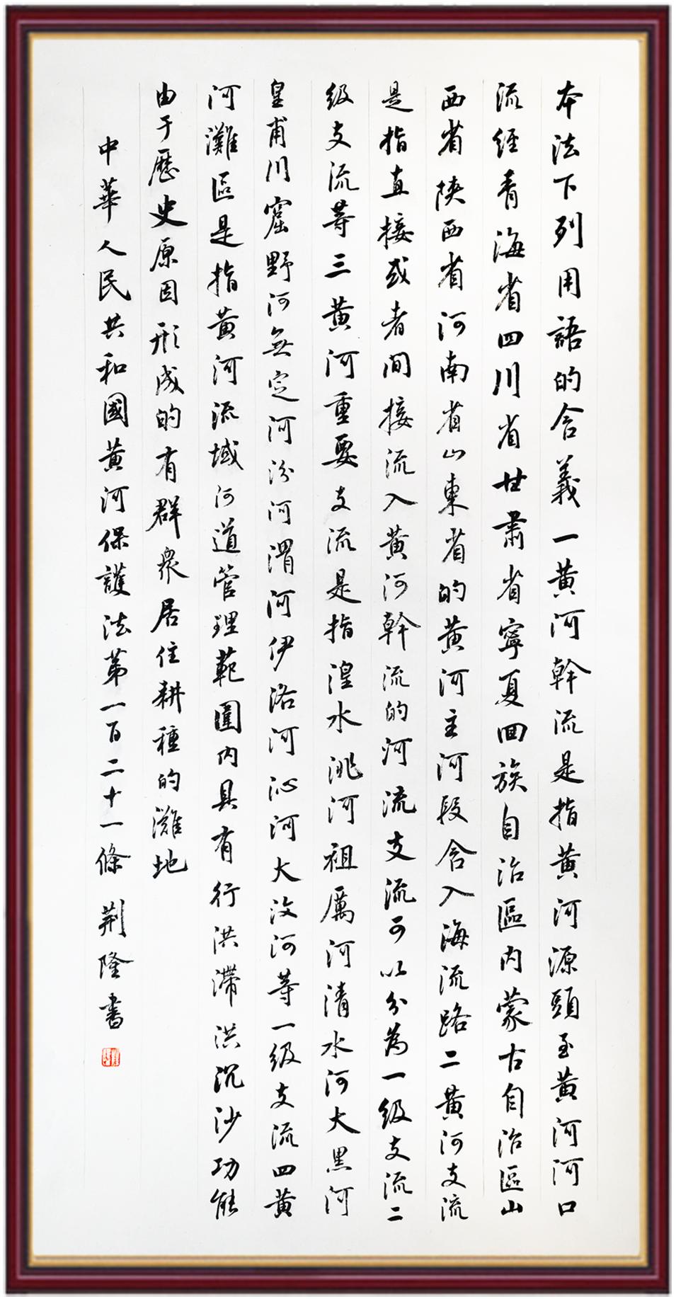 黃河寧,天下平。黃河是中華民族的發(fā)源地和搖籃,保護(hù)黃河是事關(guān)中華民族偉大復(fù)興的千秋大計(jì)?!吨腥A人民共和國(guó)黃河保護(hù)法》為推進(jìn)水資源節(jié)約集約利用、保護(hù)傳承弘揚(yáng)黃河文化、推動(dòng)黃河流域生態(tài)保護(hù)和高質(zhì)量發(fā)展提供了有力法治保障。繼書(shū)寫(xiě)《中華人民共和國(guó)民法典》《中華人民共和國(guó)憲法》《中華人民共和國(guó)澳門(mén)特別行政區(qū)基本法》《中華人民共和國(guó)香港特別行政區(qū)基本法》《中華人民共和國(guó)國(guó)旗法》《中華人民共和國(guó)國(guó)徽法》《中華人民共和國(guó)國(guó)歌法》《中華人民共和國(guó)法官法》等法律法規(guī)之后,法制日?qǐng)?bào)社聯(lián)合沿黃九省(區(qū))司法廳、書(shū)法家協(xié)會(huì),將筆端對(duì)準(zhǔn)《中華人民共和國(guó)黃河保護(hù)法》。