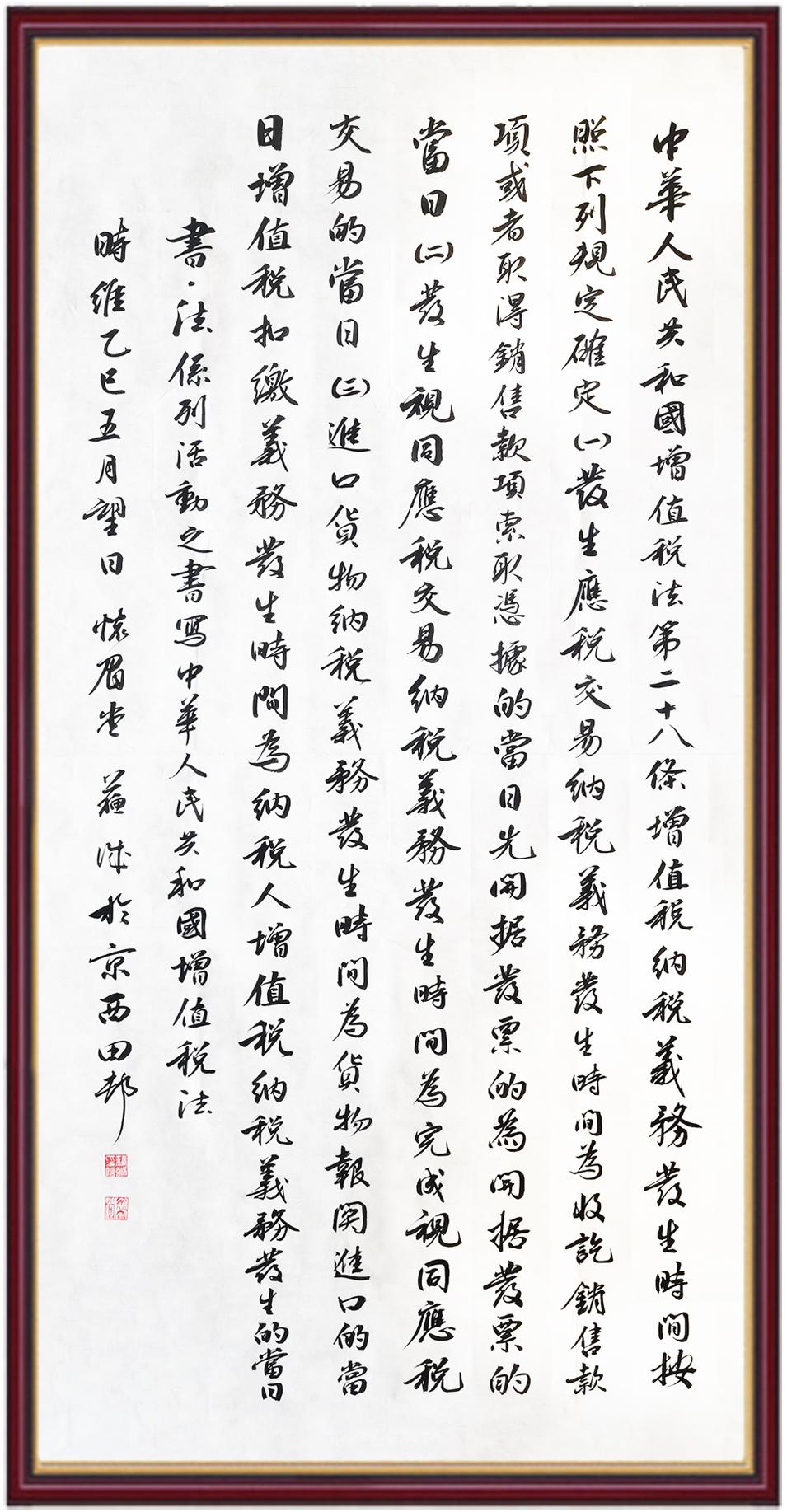 稅收一頭連著國(guó)計(jì),一頭連著民生。全面推進(jìn)依法治稅,是全面依法治國(guó)基本方略在稅收領(lǐng)域的集中體現(xiàn)?!吨腥A人民共和國(guó)增值稅法》將于2026年1月1日起施行,對(duì)全面落實(shí)稅收法定原則、健全有利于高質(zhì)量發(fā)展的增值稅制度、規(guī)范增值稅的征收和繳納、保護(hù)納稅人合法權(quán)益具有重要意義。繼書(shū)寫(xiě)《中華人民共和國(guó)民法典》《中華人民共和國(guó)憲法》《中華人民共和國(guó)國(guó)旗法》《中華人民共和國(guó)國(guó)徽法》《中華人民共和國(guó)國(guó)歌法》《中華人民共和國(guó)法官法》《中華人民共和國(guó)黃河保護(hù)法》等法律法規(guī)之后,法制日?qǐng)?bào)社將筆端對(duì)準(zhǔn)《中華人民共和國(guó)增值稅法》。