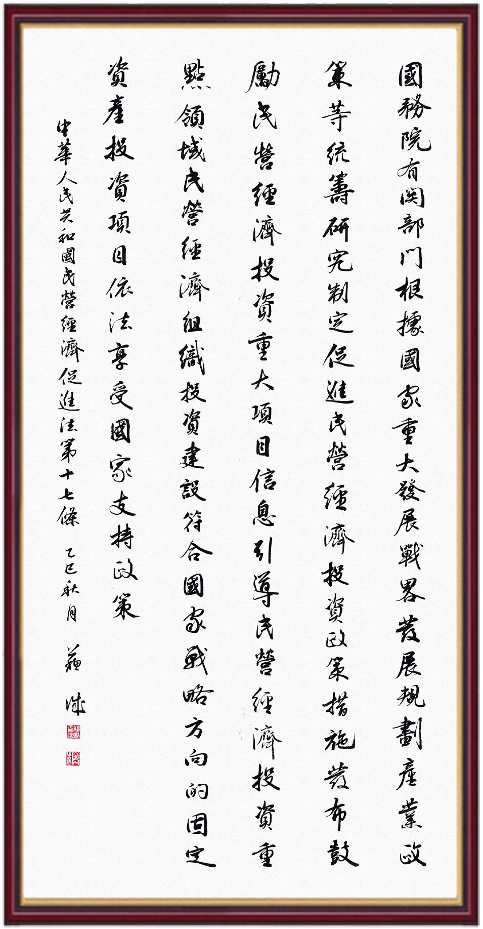 《中華人民共和國(guó)民營(yíng)經(jīng)濟(jì)促進(jìn)法》自今年5月20日起施行。作為我國(guó)首部專(zhuān)門(mén)關(guān)于民營(yíng)經(jīng)濟(jì)發(fā)展的基礎(chǔ)性法律,民營(yíng)經(jīng)濟(jì)促進(jìn)法將支持和保障民營(yíng)經(jīng)濟(jì)發(fā)展的法律制度融入中國(guó)特色社會(huì)主義法律體系,具有重大的法治意義,為促進(jìn)民營(yíng)經(jīng)濟(jì)持續(xù)、健康、高質(zhì)量發(fā)展提供了堅(jiān)實(shí)的法治保障。為更好地學(xué)習(xí)、宣傳、貫徹這部法律,法治日?qǐng)?bào)社聯(lián)合司法部普法與依法治理局,開(kāi)展“‘書(shū)·法’系列活動(dòng)之書(shū)寫(xiě)《中華人民共和國(guó)民營(yíng)經(jīng)濟(jì)促進(jìn)法》”活動(dòng)。