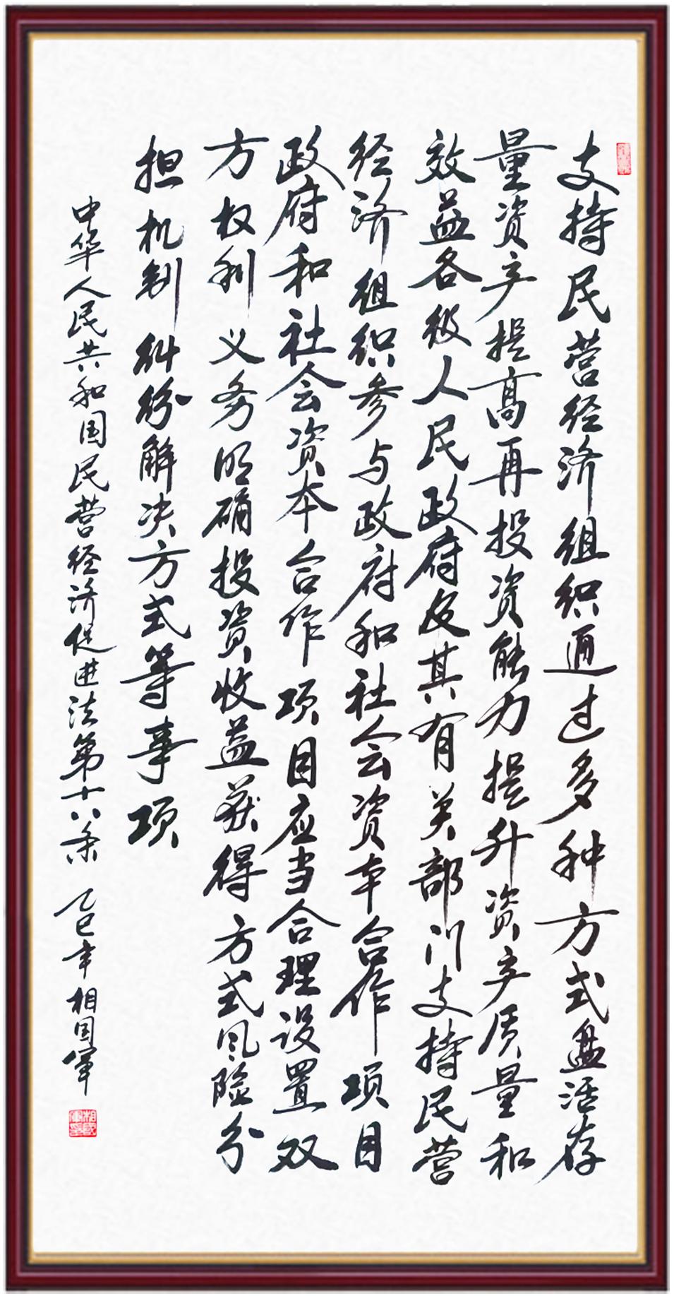 《中華人民共和國(guó)民營(yíng)經(jīng)濟(jì)促進(jìn)法》自今年5月20日起施行。作為我國(guó)首部專(zhuān)門(mén)關(guān)于民營(yíng)經(jīng)濟(jì)發(fā)展的基礎(chǔ)性法律,民營(yíng)經(jīng)濟(jì)促進(jìn)法將支持和保障民營(yíng)經(jīng)濟(jì)發(fā)展的法律制度融入中國(guó)特色社會(huì)主義法律體系,具有重大的法治意義,為促進(jìn)民營(yíng)經(jīng)濟(jì)持續(xù)、健康、高質(zhì)量發(fā)展提供了堅(jiān)實(shí)的法治保障。為更好地學(xué)習(xí)、宣傳、貫徹這部法律,法治日?qǐng)?bào)社聯(lián)合司法部普法與依法治理局,開(kāi)展“‘書(shū)·法’系列活動(dòng)之書(shū)寫(xiě)《中華人民共和國(guó)民營(yíng)經(jīng)濟(jì)促進(jìn)法》”活動(dòng)。