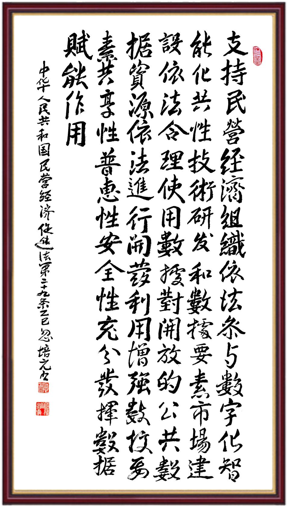《中華人民共和國民營經(jīng)濟促進法》自今年5月20日起施行。作為我國首部專門關(guān)于民營經(jīng)濟發(fā)展的基礎(chǔ)性法律,民營經(jīng)濟促進法將支持和保障民營經(jīng)濟發(fā)展的法律制度融入中國特色社會主義法律體系,具有重大的法治意義,為促進民營經(jīng)濟持續(xù)、健康、高質(zhì)量發(fā)展提供了堅實的法治保障。為更好地學(xué)習(xí)、宣傳、貫徹這部法律,法治日報社聯(lián)合司法部普法與依法治理局,開展“‘書·法’系列活動之書寫《中華人民共和國民營經(jīng)濟促進法》”活動。