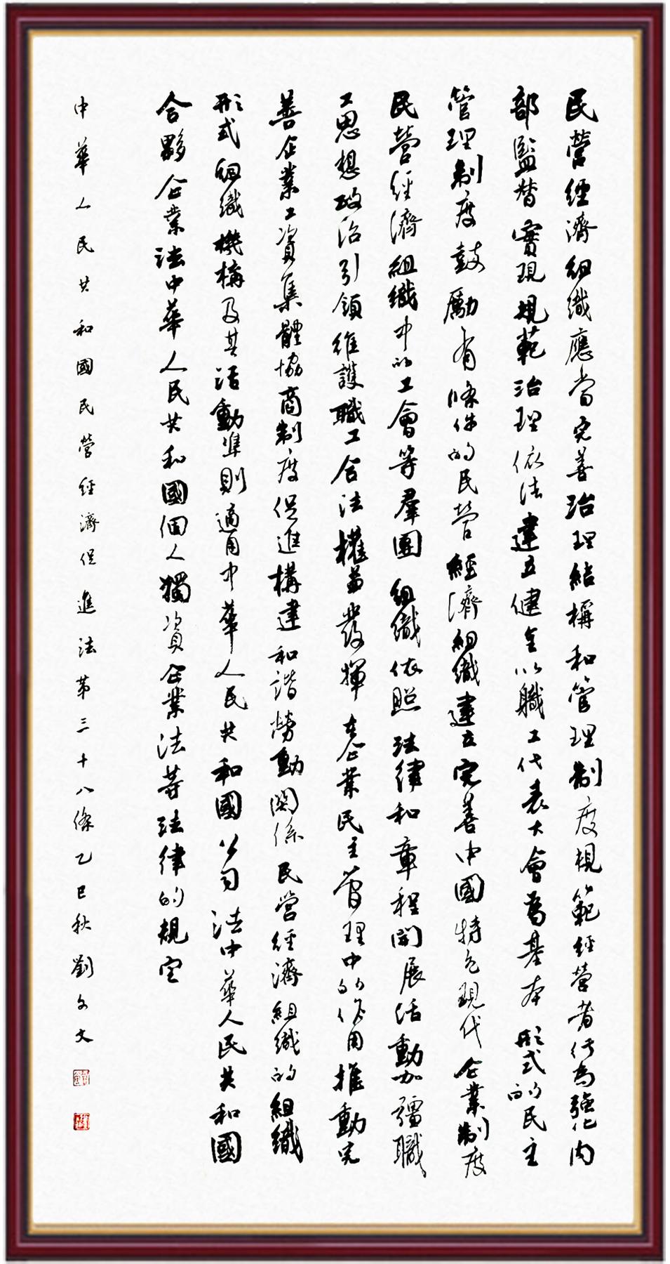 《中華人民共和國(guó)民營(yíng)經(jīng)濟(jì)促進(jìn)法》自今年5月20日起施行。作為我國(guó)首部專門關(guān)于民營(yíng)經(jīng)濟(jì)發(fā)展的基礎(chǔ)性法律,民營(yíng)經(jīng)濟(jì)促進(jìn)法將支持和保障民營(yíng)經(jīng)濟(jì)發(fā)展的法律制度融入中國(guó)特色社會(huì)主義法律體系,具有重大的法治意義,為促進(jìn)民營(yíng)經(jīng)濟(jì)持續(xù)、健康、高質(zhì)量發(fā)展提供了堅(jiān)實(shí)的法治保障。為更好地學(xué)習(xí)、宣傳、貫徹這部法律,法治日?qǐng)?bào)社聯(lián)合司法部普法與依法治理局,開(kāi)展“‘書(shū)·法’系列活動(dòng)之書(shū)寫(xiě)《中華人民共和國(guó)民營(yíng)經(jīng)濟(jì)促進(jìn)法》”活動(dòng)。