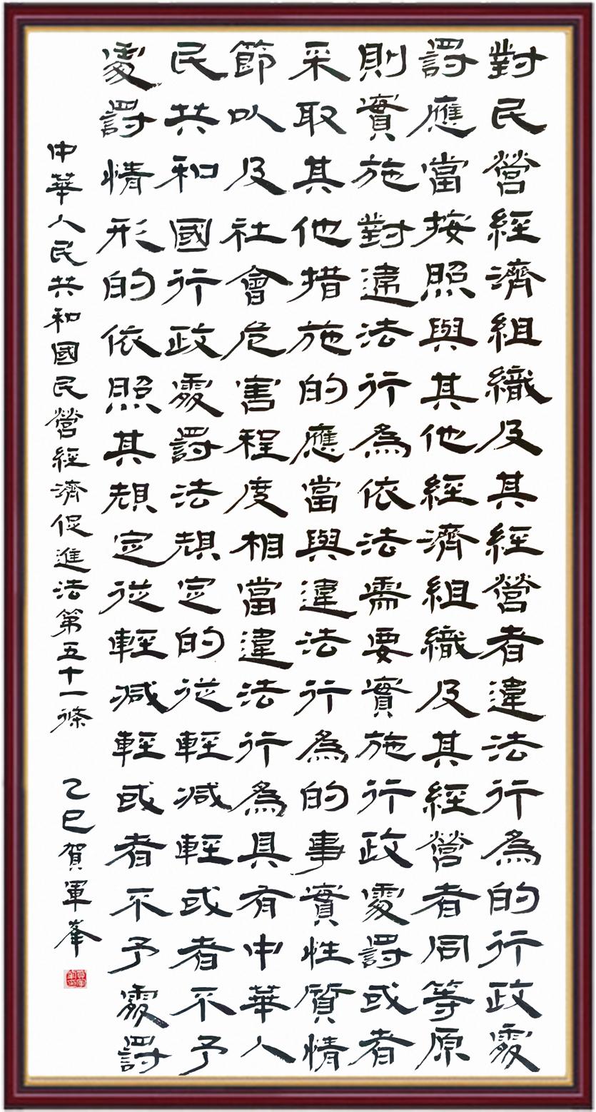 《中華人民共和國(guó)民營(yíng)經(jīng)濟(jì)促進(jìn)法》自今年5月20日起施行。作為我國(guó)首部專(zhuān)門(mén)關(guān)于民營(yíng)經(jīng)濟(jì)發(fā)展的基礎(chǔ)性法律,民營(yíng)經(jīng)濟(jì)促進(jìn)法將支持和保障民營(yíng)經(jīng)濟(jì)發(fā)展的法律制度融入中國(guó)特色社會(huì)主義法律體系,具有重大的法治意義,為促進(jìn)民營(yíng)經(jīng)濟(jì)持續(xù)、健康、高質(zhì)量發(fā)展提供了堅(jiān)實(shí)的法治保障。為更好地學(xué)習(xí)、宣傳、貫徹這部法律,法治日?qǐng)?bào)社聯(lián)合司法部普法與依法治理局,開(kāi)展“‘書(shū)·法’系列活動(dòng)之書(shū)寫(xiě)《中華人民共和國(guó)民營(yíng)經(jīng)濟(jì)促進(jìn)法》”活動(dòng)。