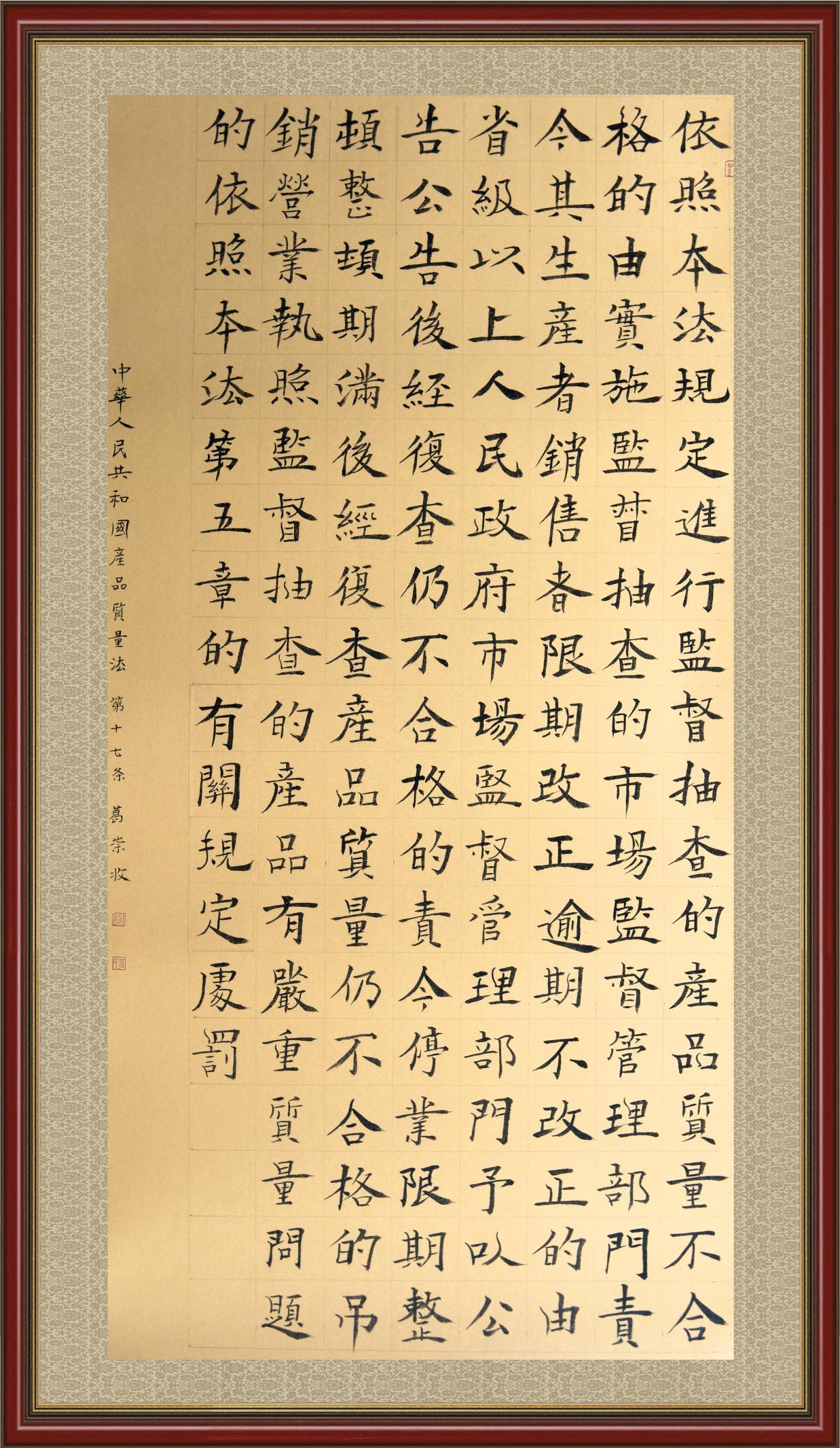《中華人民共和國產(chǎn)品質(zhì)量法》自1993年9月1日起開始施行,先后進(jìn)行三次修正。作為產(chǎn)品質(zhì)量領(lǐng)域的基本法律,產(chǎn)品質(zhì)量法對(duì)規(guī)范產(chǎn)品質(zhì)量管理、維護(hù)消費(fèi)者合法權(quán)益、促進(jìn)經(jīng)濟(jì)社會(huì)發(fā)展具有重要意義。為更好地學(xué)習(xí)、宣傳、貫徹這部法律,在國家市場(chǎng)監(jiān)督管理總局法規(guī)司的支持下,法治日?qǐng)?bào)社開展了“‘書·法’系列活動(dòng)之書寫《中華人民共和國產(chǎn)品質(zhì)量法》”活動(dòng)。